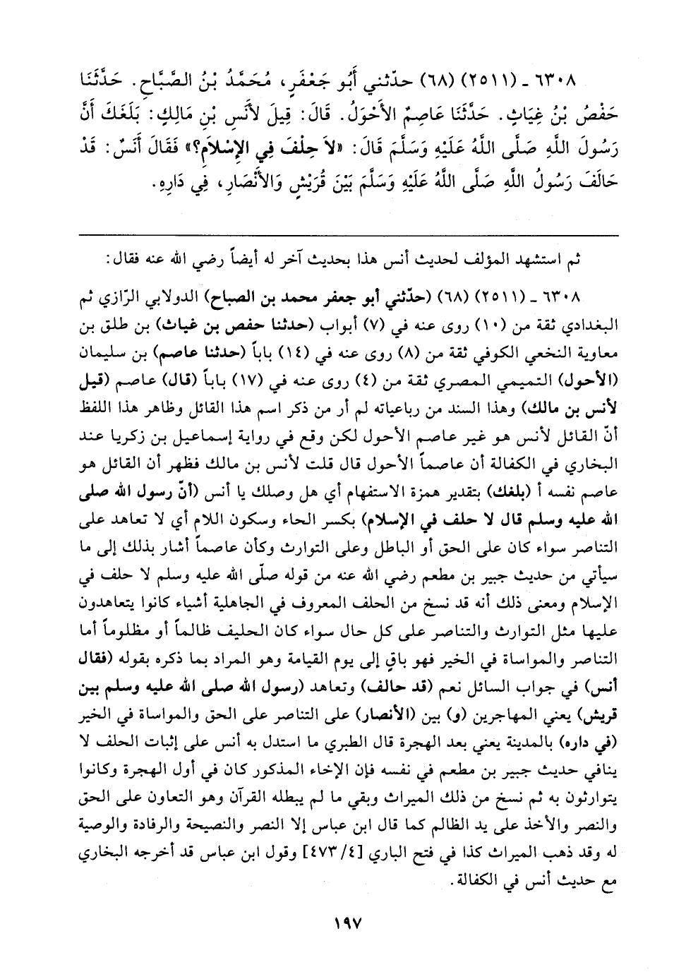 ٦٣٠٨ - (٢٥١١) (٦٨) حدّثني أَبُو جَعفَرٍ، مُحَمدُ بْنُ الصباحِ. حَدَّثَنَا حَفْصُ بْنُ غِيَاثٍ. حَدَّثَنَا عَاصِم الأَحوَلُ. قَال: قِيلَ لأنَسِ بْنِ مَالِكٍ: بَلَغَكَ أَن رَسُولَ الله صَلى الله عَلَيهِ وَسَلمَ قَال: "لَا حِلْفَ فِي الإِسْلامِ؟ " فَقَال أَنَس: قَدْ حَالفَ رَسُولُ الله صَلى الله عَلَيهِ وَسَلمَ بَينَ قُرَيشٍ وَالأنصَارِ، فِي دَارِهِ