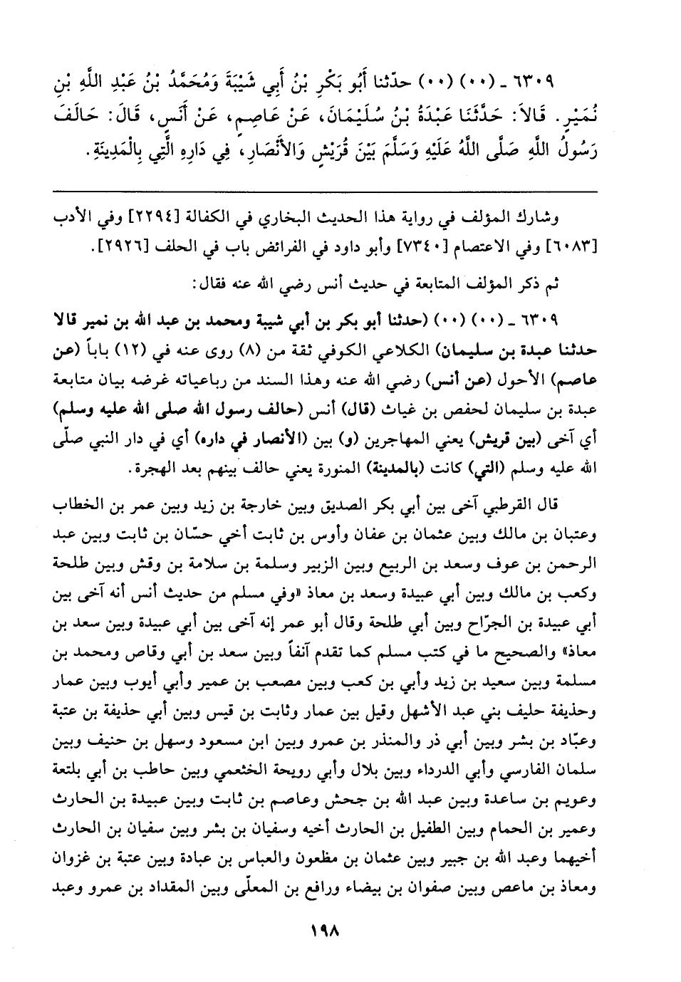 ٦٣٠٩ - (٠٠) (٠٠) (حدثنا أبو بكر بن أبي شيبة ومحمد بن عبد الله بن نمير قال حدثنا عبدة بن سليمان) الكلاعي الكوفي ثقة من (٨) روى عنه في (١٢) بابا (عن عاصم) الأحول (عن أنس) رضي الله عنه وهذا السند من رباعياته غرضه بيان متابعة عبدة بن سليمان لحفص بن غياث (قال) أنس (حالف رسول الله صلى الله عليه وسلم) أي آخى (بين قريش) يعني المهاجرين (و) بين (الأنصار في داره) أي في دار النبي صلّى الله عليه وسلم (التي) كانت (بالمدينة) المنورة يعني حالف بينهم بعد الهجرة.