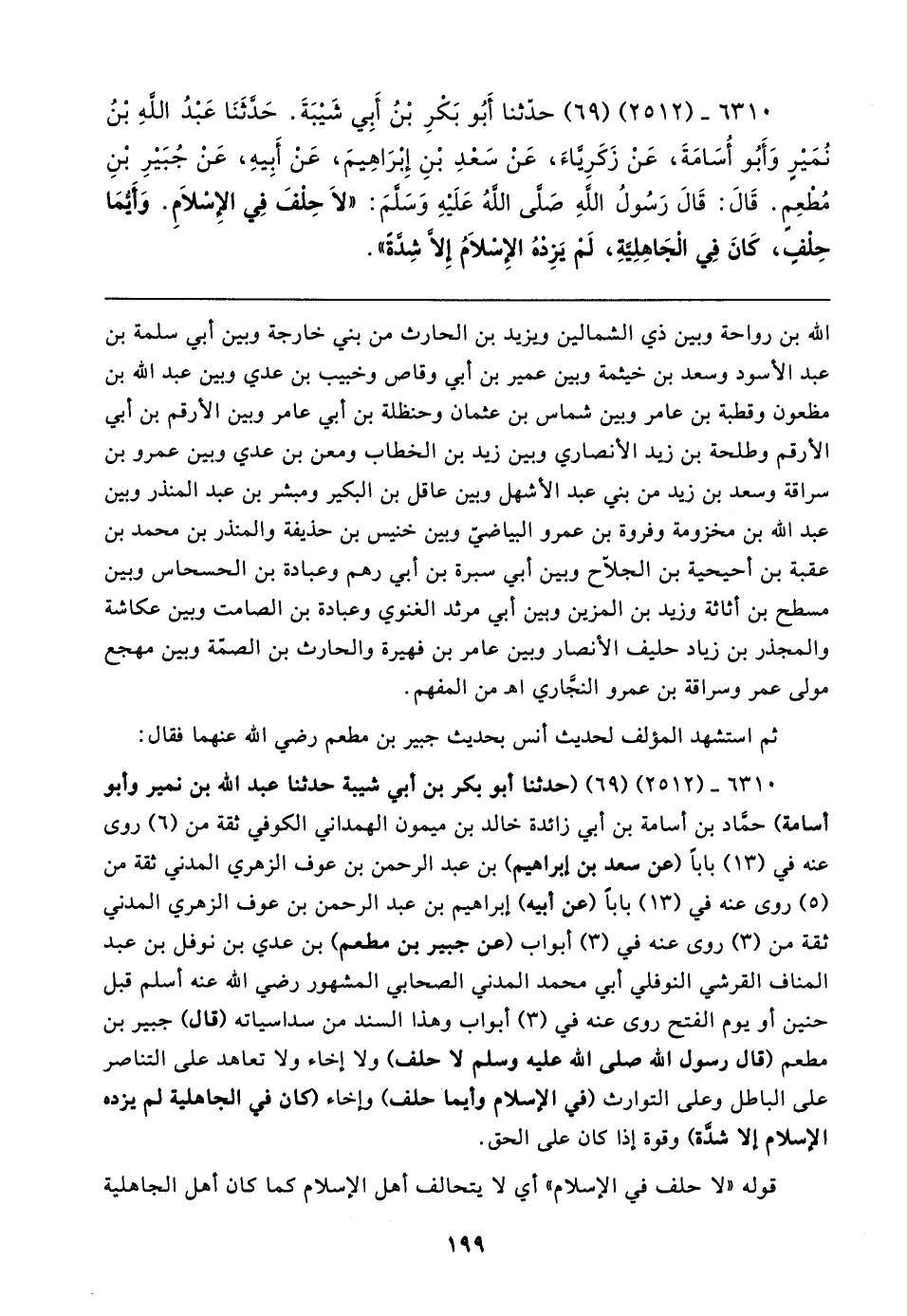 ٦٣١٠ - (٢٥١٢) (٦٩) حدثنا أَبُو بَكْرِ بْنُ أَبِي شَيبَةَ. حَدَّثَنَا عَبْدُ الله بْنُ نُمَيرٍ وَأَبُو أُسَامَةَ، عَنْ زَكَرِياءَ، عَنْ سَعْدِ بْنِ إِبْرَاهِيمَ، عَنْ أَبِيهِ، عَنْ جُبَيرِ بْنِ مُطْعِمٍ. قَال: قَال رَسُولُ الله صَلى الله عَلَيهِ وَسلمَ: "لَا حِلفَ فِي الإسْلامِ. وَأَيُّمَا حِلْفٍ، كَانَ فِي الْجَاهِلِيةِ، لَمْ يَزِدهُ الإسْلامُ إلا شِدّةً"