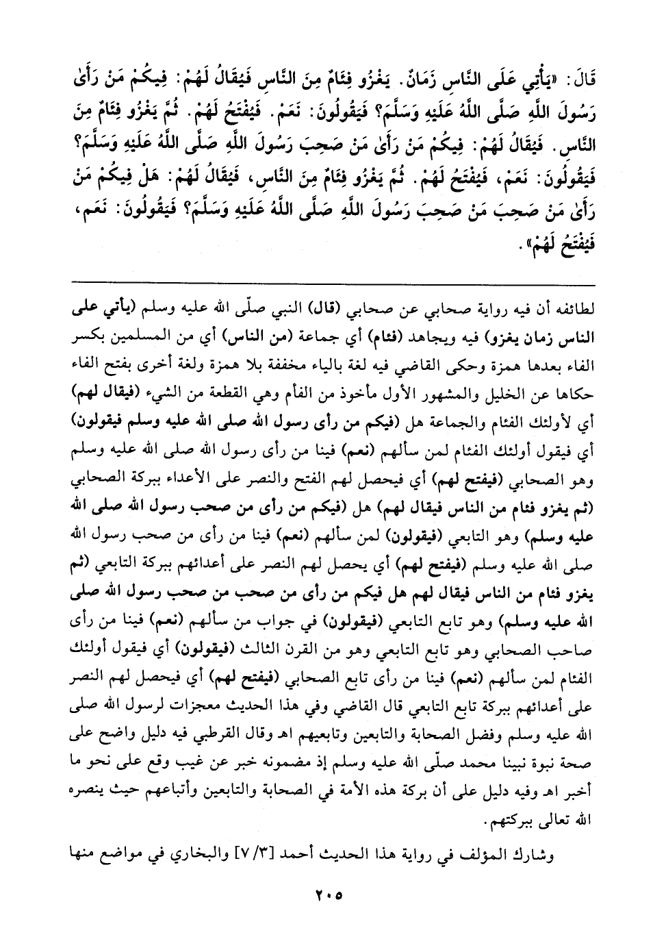 قَال: "يأتِي عَلَى الناسِ زَمَانٌ. يَغْزُو فِئَامٌ مِنَ الناسِ فَيُقَالُ لَهُم: فِيكُم مَنْ رَأَى رَسُولَ الله صَلَّى الله عَلَيهِ وَسلمَ؟ فَيَقُولُونَ: نَعَم. فَيفْتَحُ لَهُم. ثُمَّ يَغْزُو فِئَامٌ مِنَ الناسِ. فَيُقَالُ لَهُم: فِيكُم مَنْ رَأَى مَنْ صَحِبَ رَسُولَ الله صَلى الله عَلَيهِ وَسلمَ؟ فَيَقُولُونَ: نَعَم، فَيُفْتَحُ لَهُم. ثُمَّ يغْزُو فِئَامٌ مِنَ النَاسِ، فَيُقَالُ لَهُم: هلْ فِيكُم مَنْ رَأَى مَنْ صَحِبَ مَنْ صَحِبَ رَسُولَ الله صلى الله عَلَيهِ وَسَلَّمَ؟ فَيَقُولُونَ: نَعَم، فَيُفْتَحُ لَهم"