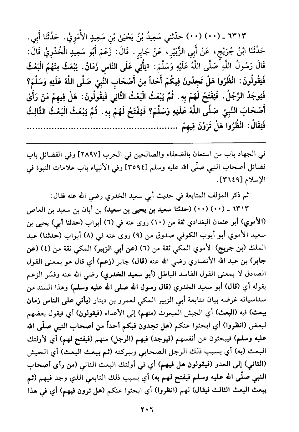 ٦٣١٣ - (٠٠) (٠٠) حدّثني سَعِيدُ بن يحيى بْنِ سَعِيدٍ الأُمَويُّ. حَدَّثَنَا أَبِي. حَدَّثَنَا ابنُ جُرَيجٍ، عن أَبِي الزبَيرِ، عَنْ جَابِرٍ. قَال: زَعَمَ أَبُو سَعِيدٍ الْخُدري قَال: قَال رَسُولُ الله صَلى الله عَلَيهِ وَسلمَ: "يَأتي عَلَى الناس زَمَانٌ. يُبعَثُ مِنهُمُ الْبعثُ فَيَقُولُونَ: انْظُرُوا هلْ تَجِدُونَ فِيكُم أَحَدًا مِنْ أَصحَابِ النَّبِي صَلى الله عَلَيهِ وَسلم؟ فَيُوجَدُ الرجُلُ. فَيُفتَحُ لَهُم بِهِ. ثُمَّ يُبعَثُ الْبَعثُ الثانِي فَيَقُولُونَ: هل فِيهِم مَنْ رَأَى أَصحَابَ النَّبِيّ صَلى الله عَلَيهِ وَسلم؟ فَيُفتَحُ لَهم بِهِ. ثُمَّ يُبْعَثُ البعثُ الثالِثُ فَيُقَالُ: انظُرُوا هل تَرَوْنَ فِيهِم