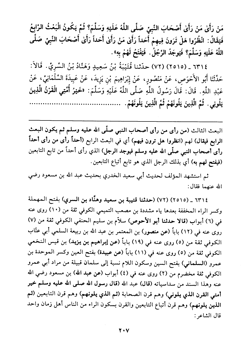 ٦٣١٤ - (٢٥١٥) (٧٢) حدثنا قُتَيبَةُ بْنُ سَعِيدٍ وَهنادُ بْنُ السرِيِّ. قَالا: حَدَّثَنَا أَبُو الأحوَصِ، عَنْ مَنْصُورٍ، عَنْ إِبْرَاهِيمَ بْنِ يَزِيدَ، عَنْ عَبِيدَةَ السلْمَانِي، عَنْ عَبْدِ الله. قَال: قَال رَسُولُ الله صَلى الله عَلَيهِ وَسلمَ: "خَيرُ أمتِي الْقَرنُ الذِينَ يَلُوني. ثُمَّ الذِينَ يَلُونَهم ثُمَّ الذِينَ يَلُونَهُم