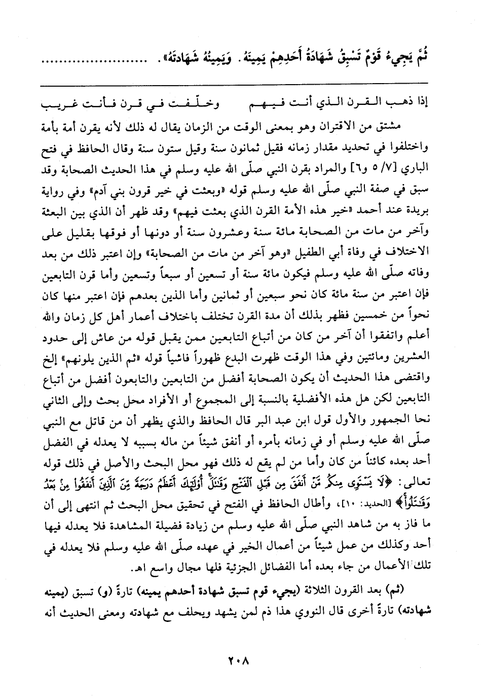 مشتق من الاقتران وهو بمعنى الوقت من الزمان يقال له ذلك لأنه يقرن أمة بأمة واختلفوا في تحديد مقدار زمانه فقيل ثمانون سنة وقيل ستون سنة وقال الحافظ في فتح الباري [٧/ ٥ و ٦] والمراد بقرن النبي صلى الله عليه وسلم في هذا الحديث الصحابة وقد سبق في صفة النبي صلى الله عليه وسلم قوله "وبعثت في خير قرون بني آدم" وفي رواية بريدة عند أحمد "خير هذه الأمة القرن الذي بعثت فيهم" وقد ظهر أن الذي بين البعثة وآخر من مات من الصحابة مائة سنة وعشرون سنة أو دونها أو فوقها بقليل على الاختلاف في وفاة أبي الطفيل "وهو آخر من مات من الصحابة" لمان اعتبر ذلك من بعد وفاته صلى الله عليه وسلم فيكون مائة سنة أو تسعين أو سبعًا وتسعين وأما قرن التابعين فإن اعتبر من سنة مائة كان نحو سبعين أو ثمانين وأما الذين بعدهم فإن اعتبر منها كان نحوًا من خمسين فظهر بذلك أن مدة القرن تختلف باختلاف أعمار أهل كل زمان والله أعلم واتفقوا أن آخر من كان من أتباع التابعين ممن يقبل قوله من عاش إلى حدود العشرين ومائتين وفي هذا الوقت ظهرت البدع ظهورًا فاشيًا قوله "ثم الذين يلونهم" إلخ واقتضى هذا الحديث أن يكون الصحابة أفضل من التابعين والتابعون أفضل من أتباع التابعين لكن هل هذه الأفضلية بالنسبة إلى المجموع أو الأفراد محل بحث وإلى الثاني نحا الجمهور والأول قول ابن عبد البر قال الحافظ والذي يظهر أن من قاتل مع النبي صلى الله عليه وسلم أو في زمانه بأمره أو أنفق شيئًا من ماله بسببه لا يعدله في الفضل أحد بعده كائنًا من كان وأما من لم يقع له ذلك فهو محل البحث والأصل في ذلك قوله تعالى: {لَا يَسْتَوي مِنْكُمْ مَنْ أَنْفَقَ مِنْ قَبْلِ الْفَتْحِ وَقَاتَلَ أُولَئِكَ أَعْظَمُ دَرَجَةً مِنَ الَّذِينَ أَنْفَقُوا مِنْ بَعْدُ وَقَاتَلُوا} [الحديد: ١٠]، وأطال الحافظ في الفتح في تحقيق محل البحث ثم انتهى إلى أن ما فاز به من شاهد النبي صلى الله عليه وسلم من زيادة فضيلة المشاهدة فلا يعدله فيها أحد وكذلك من عمل شيئًا من أعمال الخير في عهده صلى الله عليه وسلم فلا يعدله في تلك الأعمال من جاء بعده أما الفضائل الجزئية فلها مجال واسع اهـ.