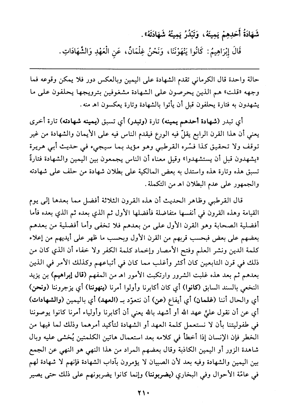 قال القرطبي وظاهر الحديث أن هذه القرون الثلاثة أفضل مما بعدها إلى يوم القيامة وهذه القرون في أنفسها متفاضلة فأفضلها الأول ثم الذي بعده ثم الذي بعده فأما أفضلية الصحابة وهو القرن الأول على من بعدهم فلا تخفى وأما أفضلية من بعدهم بعضهم على بعض فبحسب قربهم من القرن الأول وبحسب ما ظهر على أيديهم من إعلاء كلمة الدين ونشر العلم وفتح الأمصار وإخماد كلمة الكفر ولا خفاء أن الذي كان من ذلك في قرن التابعين كان أكثر وأغلب مما كان في أتباعهم وكذلك الأمر في الذين بعدهم ثم بعد هذه غلبت الشرور وارتكبت الأمور اهـ من المفهم (قال إبراهيم) بن يزيد النخعي بالسند السابق (كانوا) أي كان أكابرنا وأولوا أمرنا (ينهوننا) أي يزجروننا (ونحن) أي والحال أننا (غلمان) أي أيفاع (عن) أن نتعوّد بـ (العهد) أي باليمين (والشهادات) أي عن أن نقول على عهد الله أو أشهد بالله يعني أن أكابرنا وأولياء أمرنا كانوا يوصوننا في طفوليتنا بأن لا نستعمل كلمة العهد أو الشهادة لتأكيد أمرهما وذلك لما فيها من الخطر فإن الإنسان إذا أخطأ في كلامه بعد استعمال هاتين الكلمتين يُخشى عليه وبال شاهدة الزور أو اليمين الكاذبة وقال بعضهم المراد من هذا النهي هو النهي عن الجمع بين اليمين والشهادة وفيه بعد لأن الصبيان لا يؤمرون بآداب الشهادة فإنم لا شهادة لهم في عامة الأحوال وفي البخاري (يضربوننا) وإنما كانوا يضربونهم على ذلك حتى يصير