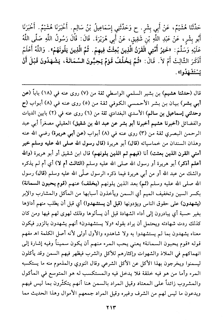 حَدَثَنَا هُشَيم، عَنْ أَبِي بِشْرٍ. ح وَحَدَّثَنِي إِسْمَاعِيلُ بْنُ سَالِمٍ. أَخْبَرَنَا هُشَيم. أَخْبَرَنَا أَبُو بِشْرٍ، عَنْ عَبْدِ الله بْنِ شَقِيقٍ، عَنْ أَبِي هُرَيرَةَ. قَال: قَال رَسُولُ الله صَلى الله عَلَيهِ وَسَلمَ: "خَيرُ أُمتِي الْقَرنُ الذِينَ بُعِثْتُ فِيهِم. ثُمَّ الذِينَ يَلُونَهُم". وَاللهُ أَعلَمُ أَذَكَرَ الثالِثَ أم لَا. قَال: "ثُمَّ يَخْلُفُ قَوْم يُحِبونَ السمَانَةَ، يَشْهدُونَ قَبْلَ أَنْ يُسْتَشْهدُوا"