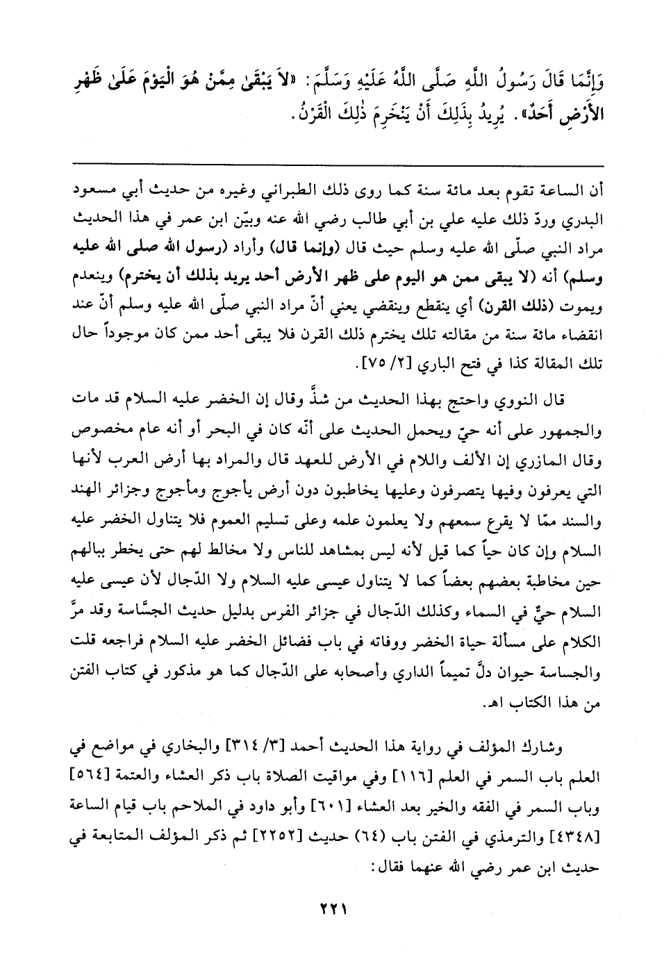 وَإِنَّمَا قَال رَسُولُ الله صَلَّى الله عَلَيهِ وَسلَّمَ: "لَا يَبْقَى مِمَّنْ هُوَ الْيَوْمَ عَلَى ظَهْرِ الأَرْضِ أَحَدٌ". يُرِيدُ بِذَلِكَ أَنْ يَنْخَرِمَ ذلِكَ الْقَرْنُ