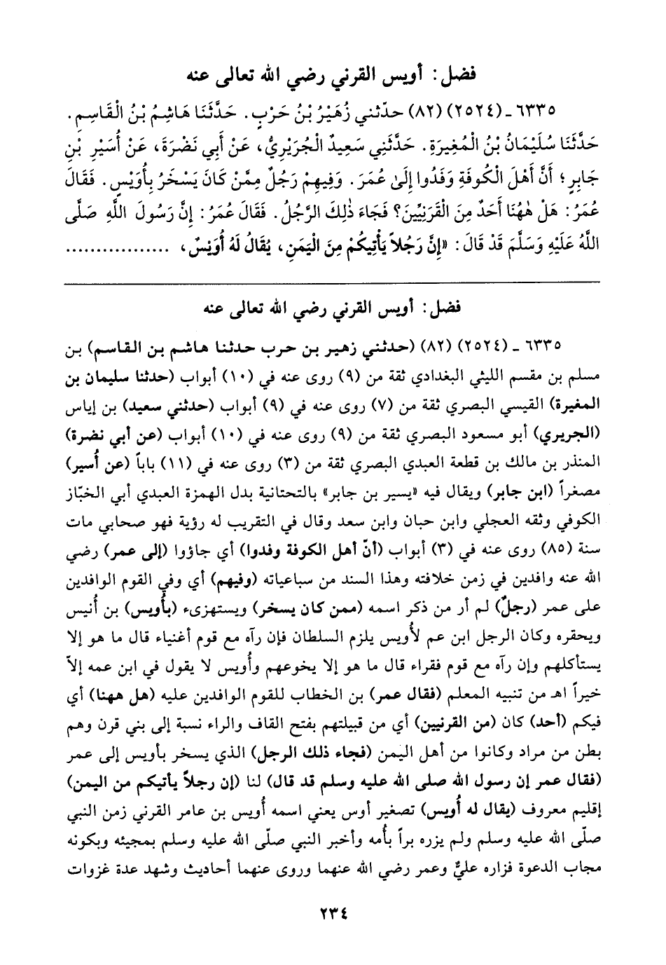 ٦٣٣٥ - (٢٥٢٤) (٨٢) حدّثني زُهيرُ بن حَرْبٍ. حَدَّثَنَا هاشِمُ بْنُ الْقَاسِمِ. حَدَّثَنَا سُلَيمَانُ بْنُ الْمُغِيرَةِ. حَدَّثَنِي سَعِيدٌ الْجُرَيرِيُّ، عَنْ أَبِي نَضْرَةَ، عَنْ أُسَيرِ بْنِ جَابِرٍ؛ أَنَّ أَهْلَ الْكُوفَةِ وَفَدُوا إِلَى عُمَرَ. وَفِيهِمْ رَجُل مِمَّنْ كَانَ يَسْخَرُ بِأُوَيسٍ. فَقَال عُمَرُ: هلْ ههُنَا أَحَدٌ مِنَ الْقَرَنِيِّينَ؟ فَجَاءَ ذلِكَ الرَّجُلُ. فَقَال عُمَرُ: إِنَّ رَسُولَ الله صَلَّى الله عَلَيهِ وَسَلَّمَ قَدْ قَال: "إِن رَجُلًا يَأتِيكُمْ مِنَ الْيَمَنِ، يُقَالُ لَهُ أُوَيسٌ،