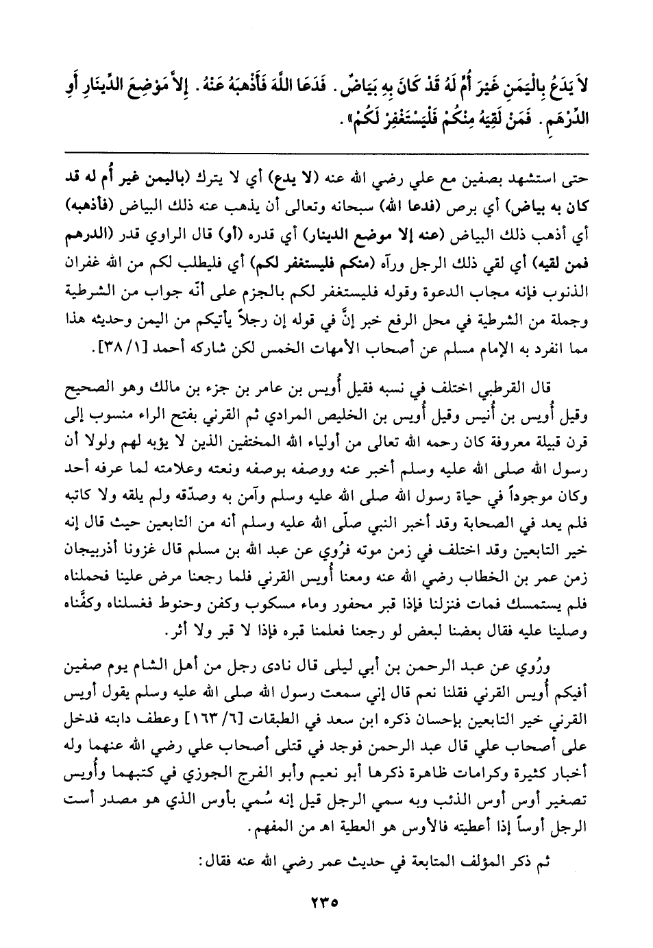 ورُوي عن عبد الرحمن بن أبي ليلى قال نادى رجل من أهل الشام يوم صفين أفيكم أُويس القرني فقلنا نعم قال إني سمعت رسول الله صلى الله عليه وسلم يقول أويس القرني خير التابعين بإحسان ذكره ابن سعد في الطبقات [٦/ ١٦٣] وعطف دابته فدخل على أصحاب علي قال عبد الرحمن فوجد في قتلى أصحاب علي رضي الله عنهما وله أخبار كثيرة وكرامات ظاهرة ذكرها أبو نعيم وأبو الفرج الجوزي في كتبهما وأُويس تصغير أوس أوس الذئب وبه سمي الرجل قيل إنه سُمي بأوس الذي هو مصدر أست الرجل أوسًا إذا أعطيته فالأوس هو العطية اهـ من المفهم.