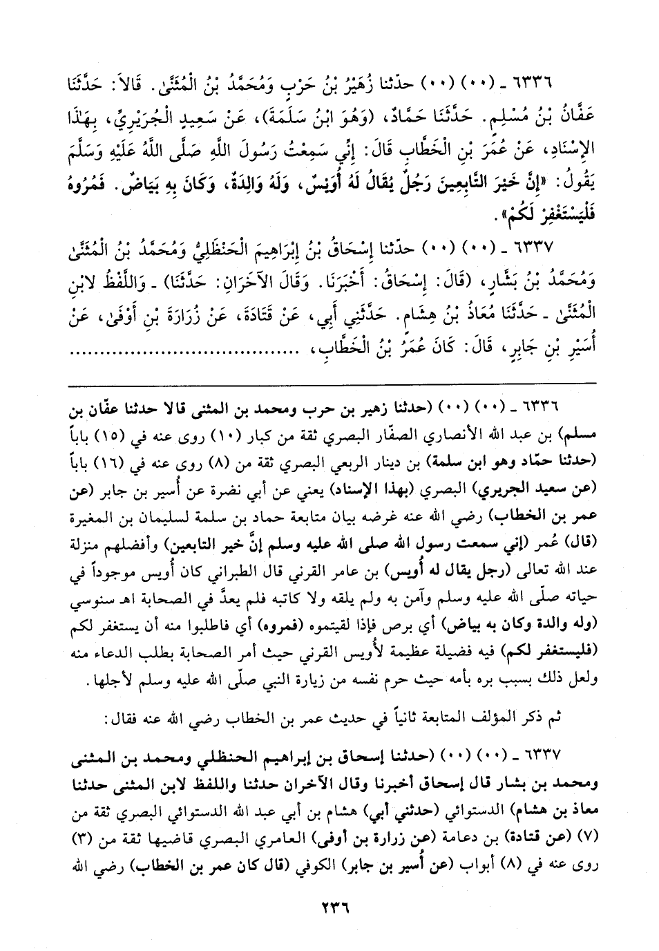 ٦٣٣٦ - (٠٠) (٠٠) حدَّثنا زُهيرُ بْنُ حَرْبٍ وَمُحَمَّدُ بْنُ الْمُثَنَّى. قَالا: حَدَّثَنَا عَفَّانُ بْنُ مُسْلِمٍ. حَدَّثَنَا حَمَّادٌ، (وَهُوَ ابْنُ سَلَمَةَ)، عَنْ سَعِيدٍ الْجُرَيرِيِّ، بِهَذَا الإِسْنَادِ، عَنْ عُمَرَ بْنِ الْخَطَّاب قَال: إِنِّي سَمِعْتُ رَسُولَ الله صَلَّى اللهُ عَلَيهِ وَسَلَّمَ يَقُولُ: "إِنَّ خَيرَ التَّابِعِينَ رَجُلٌ يُقَالُ لَهُ أُوَيسٌ، وَلَهُ وَالِدَةٌ، وَكَانَ بِهِ بَيَاضٌ. فَمُرُوهُ فَلْيَسْتَغْفِرْ لَكُمْ".