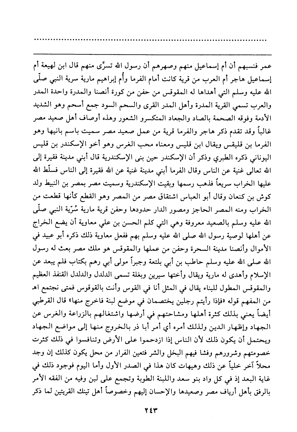 عمر فنسبهم أن أم إسماعيل منهم وصهرهم أن رسول الله تسرَّى منهم قال ابن لهيعة أم إسماعيل هاجر أم العرب من قرية كانت أمام الفرما وأُم إبراهيم مارية سرية النبي صلّى الله عليه وسلم التي أهداها له المقوقس من حفن من كورة أنصنا والمدرة واحدة المدر والعرب تسمي القرية المدرة وأهل المدر القرى والسحم السود جمع أسحم وهو الشديد الأدمة وفوقه الصحمة بالصاد والجعاد المتكسرو الشعور وهذه أوصاف أهل صعيد مصر غالبًا وقد تقدم ذكر هاجر والفرما قرية من عمل سعيد مصر سميت باسم بانيها وهو الفرما بن قليقس ويقال ابن قليس ومعناه محب الغرس وهو أخو الإسكندر بن قليس اليوناني ذكره الطبري وذكر أن الإسكندر حين بنى الإسكندرية قال أبني مدينة فقيرة إلى الله تعالى غنية عن الناس وقال الفرما أبني مدينة غنية عن الله فقيرة إلى الناس فسلّط الله عليها الخراب سريعًا فذهب رسمها وبقيت الإسكندرية وسميت مصر بمصر بن النبيط ولد كوش بن كنعان وقال أبو العباس اشتقاق مصر من المصر وهو القطع كأنها قطعت من الخراب ومنه المصر الحاجز ومصور الدار حدودها وحفن قرية مارية سُرّية النبي صلّى الله عليه وسلم بالصعيد معروفة وهي التي كلم الحسن بن علي معاوية أن يضع الخراج عن أهلها لوصية رسول الله صلى الله عليه وسلم بهم ففعل معاوية ذلك ذكره أبو عبيد في الأموال وأنصنا مدينة السحرة وحفن من عملها والمقوقس هو ملك مصر بعث له رسول الله صلى الله عليه وسلم حاطب بن أبي بلتعة وجبرًا مولى أبي رهم بكتاب فلم يبعد عن الإسلام وأهدى له مارية ويقال وأختها سيرين وبغلة تسمى الدلدل والدلدل القنفذ العظيم والمقوقس المطول للبناء يقال في المثل أنا في القوس وأنت بالقوقوس فمتى نجتمع اهـ من المفهم قوله "فإذا رأيتم رجلين يختصمان في موضع لبنة فاخرج منها" قال القرطبي أيضًا يعني بذلك كثرة أهلها ومشاحتهم في أرضها واشتغالهم بالزراعة والغرس عن الجهاد وإظهار الدين ولذلك أمره أي أمر أبا ذر بالخروج منها إلى مواضع الجهاد ويحتمل أن يكون ذلك لأن الناس إذا ازدحموا على الأرض وتنافسوا في ذلك كثرت خصومتهم وشرورهم وفشا فيهم البخل والشر فتعين الفرار من محل يكون كذلك إن وجد محلًا آخر خليًا عن ذلك وهيهات كان هذا في الصدر الأول وأما اليوم فوجود ذلك في غاية البعد إذ في كل واد بنو سعد واللبنة الطوبة وتجمع على لبن وفيه من الفقه الأمر بالرفق بأهل أرياف مصر وصعيدها والإحسان إليهم وخصوصًا أهل تينك القريتين لما ذكر