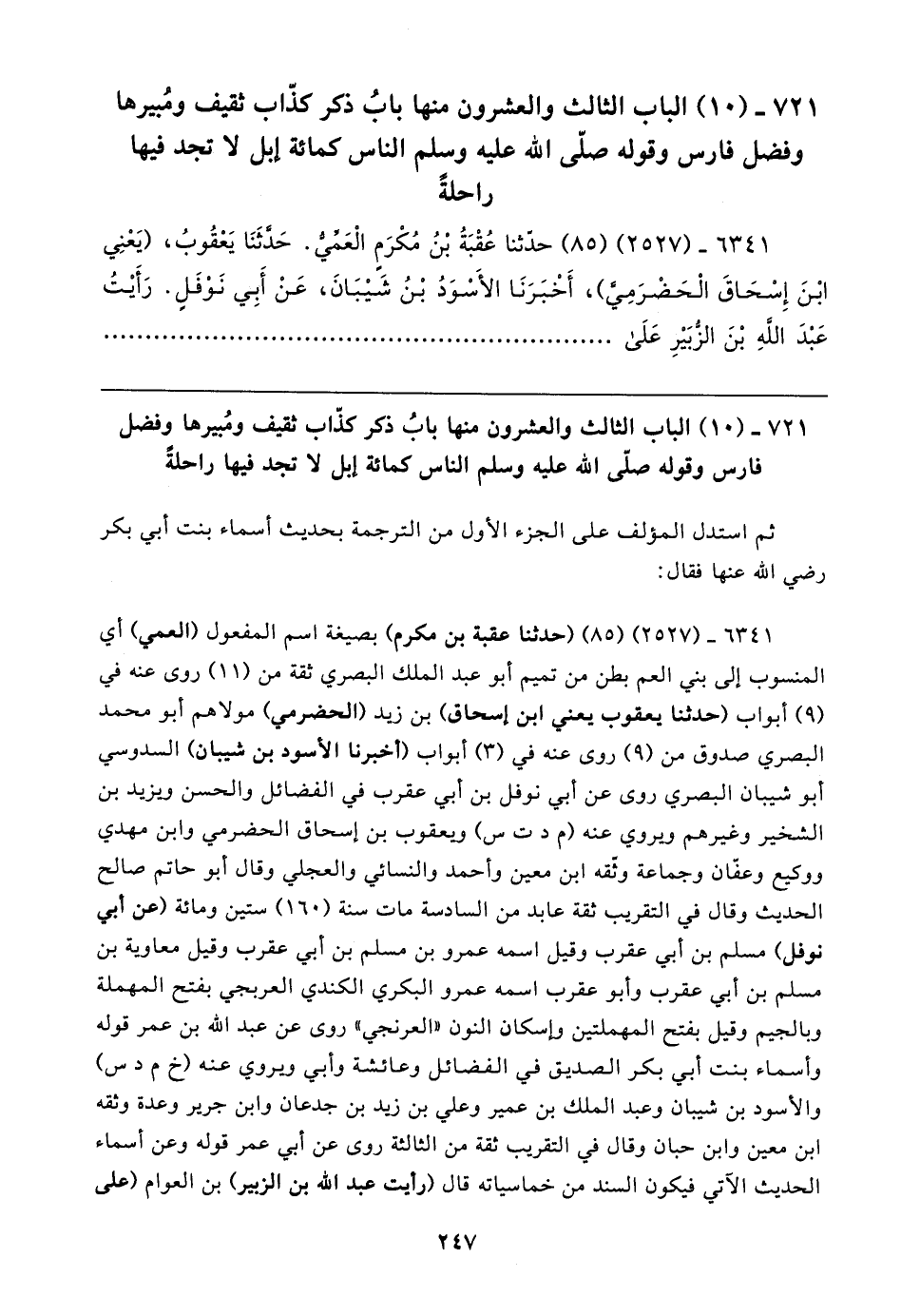 ٧٢١ - (١٠) الباب الثالث والعشرون منها بابُ ذكر كذّاب ثقيف ومُبيرها وفضل فارس وقوله صلى الله عليه وسلم الناس كمائة إبل لا تجد فيها راحلةً