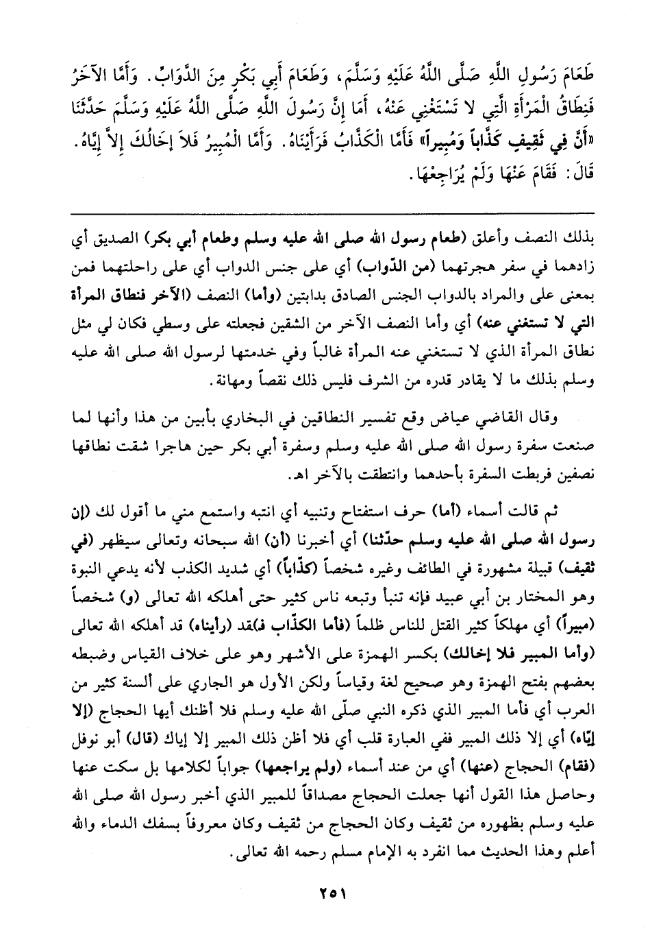 طَعَامَ رَسُولِ الله صَلَّى الله عَلَيهِ وَسَلَّمَ، وَطَعَامَ أَبِي بَكْرِ مِنَ الدَّوَابِّ. وَأَمَّا الآخَرُ فَنِطَاقُ الْمَرْأَةِ الَّتِي لا تَسْتَغْنِي عَنْهُ، أَمَا إِنَّ رَسُولَ الله صَلَّى الله عَلَيهِ وَسَلَّمَ حَدَّثَنَا "أَنَّ فِي ثَقِيفٍ كَذَّابًا وَمُبِيرًا" فَأَمَّا الْكَذَّابُ فَرَأَينَاهُ. وَأَمَّا الْمُبِيرُ فَلَا إخَالُكَ إلا إِيَّاهُ. قَال: فَقَامَ عَنْهَا وَلَمْ يُرَاجِعْهَا
