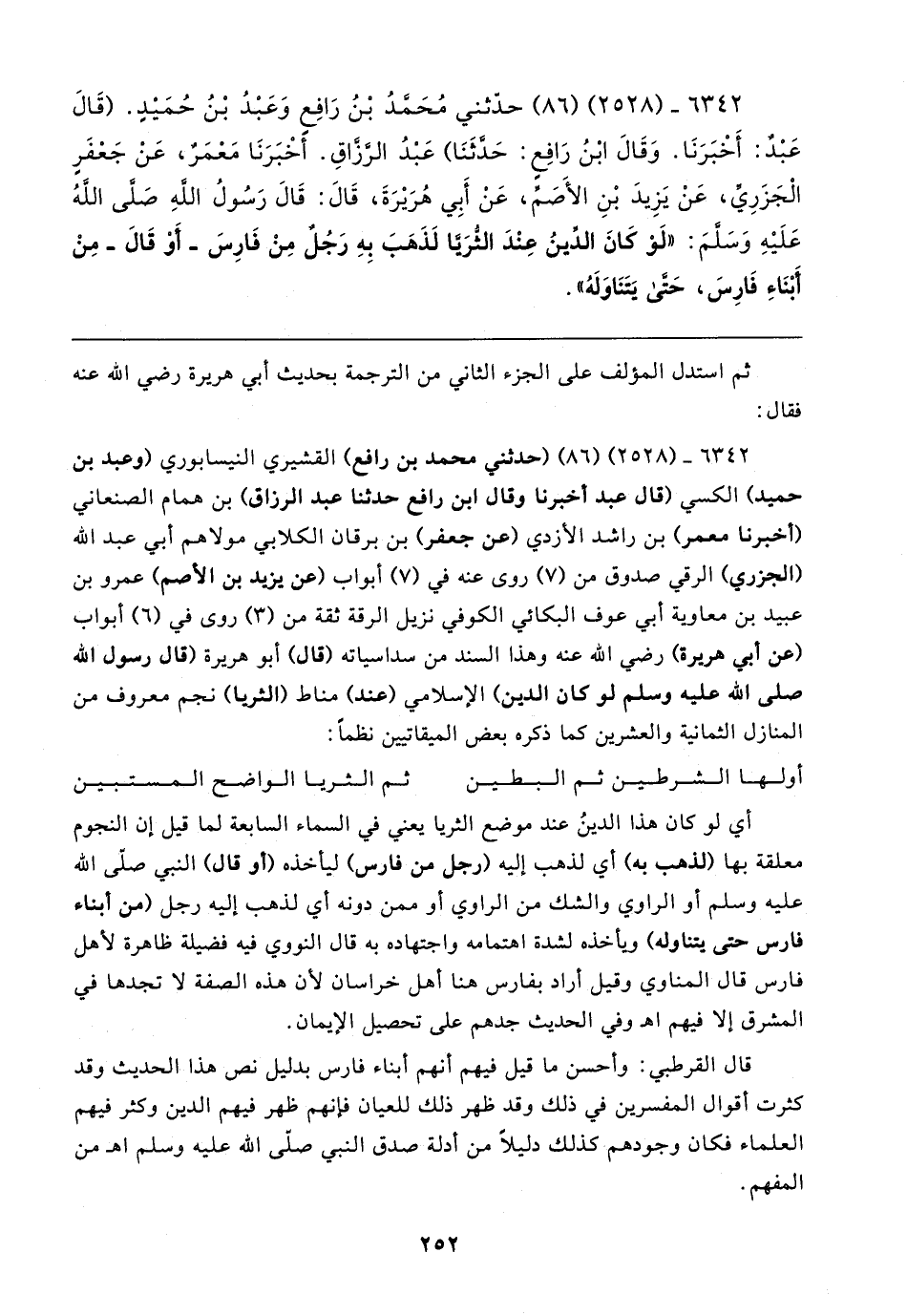 ٦٣٤٢ - (٢٥٢٨) (٨٦) حدّثني مُحَمَّدُ بْنُ رَافِعٍ وَعَبْدُ بْنُ حُمَيدٍ. (قَال عَبْدٌ: أَخْبَرَنَا. وَقَال ابْنُ رَافِعٍ: حَدَّثَنَا) عَبْدُ الرَّزَّاقِ. أَخْبَرَنَا مَعْمَرٌ، عَنْ جَعْفَرٍ الْجَزَرِيِّ، عَنْ يَزِيدَ بْنِ الأَصَمِّ، عَنْ أَبِي هُرَيرَةَ، قَال: قَال رَسُولُ الله صَلَّى اللهُ عَلَيهِ وَسَلَّمَ: "لَوْ كَانَ الدِّينُ عِنْدَ الثُّرَيَّا لَذَهَبَ بِهِ رَجُلٌ مِنْ فَارِسَ -أَوْ قَال- مِنْ أَبْنَاءِ فَارِسَ، حَتَّى يَتَنَاوَلَهُ"