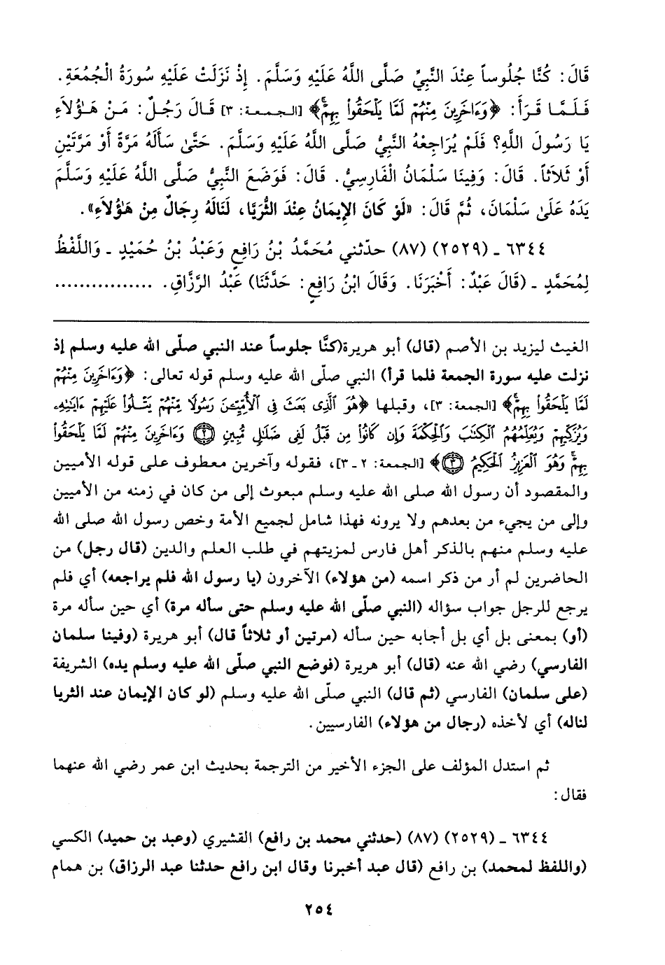 قَال: كُنَّا جُلُوسًا عِنْدَ النَّبِيِّ صَلَّى اللهُ عَلَيهِ وَسَلَّمَ. إِذْ نَزَلَتْ عَلَيهِ سُورَةُ الْجُمُعَةِ. فَلَما قَرَأَ: {وَآخَرِينَ مِنْهُمْ لَمَّا يَلْحَقُوا بِهِمْ} [الجمعة: ٣] قَال رَجُلٌ: مَنْ هؤُلاءِ يَا رَسُولَ الله؟ فَلَمْ يُرَاجِعْهُ النَّبِيُّ صَلَّى الله عَلَيهِ وَسَلَّمَ. حَتَّى سَأَلَهُ مَرَّة أَوْ مَرَّتَينِ أَوْ ثَلاثًا. قَال: وَفِينَا سَلْمَانُ الْفَارِسيُّ. قَال: فَوَضَع النَّبِيُّ صَلَّى الله عَلَيهِ وَسَلَّمَ يَدَهُ عَلَى سَلْمَانَ، ثُمَّ قَال: "لَوْ كَانَ الإِيمَانُ عِنْدَ الثُّرَيَّا، لَنَالهُ رِجَالٌ مِنْ هؤُلاءِ".