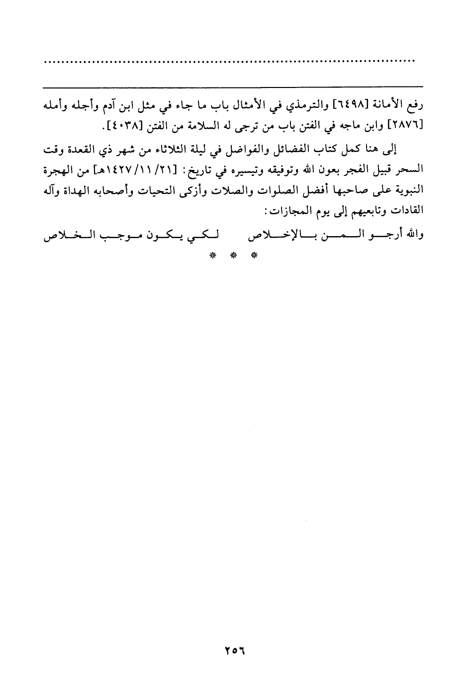 إلى هنا كمل كتاب الفضائل والفواضل في ليلة الثلاثاء من شهر ذي القعدة وقت السحر قبيل الفجر بعون الله وتوفيقه وتيسيره في تاريخ: [٢١/ ١١ / ١٤٢٧ هـ] من الهجرة النبوية على صاحبها أفضل الصلوات والصلات وأزكى التحيات وأصحابه الهداة وآله القادات وتابعيهم إلى يوم المجازات: