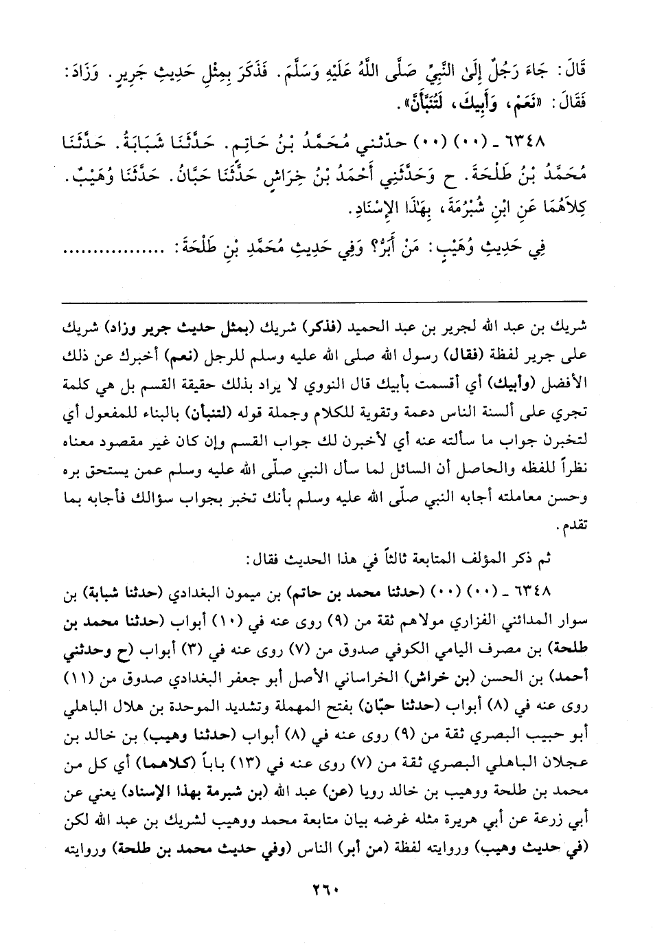 ٦٣٤٨ - (٠٠) (٠٠) (حدثنا محمد بن حاتم) بن ميمون البغدادي (حدثنا شبابة) بن سوار المدائني الفزاري مولاهم ثقة من (٩) روى عنه في (١٠) أبواب (حدثنا محمد بن طلحة) بن مصرف اليامي الكوفي صدوق من (٧) روى عنه في (٣) أبواب (ح وحدثني أحمد) بن الحسن (بن خراش) الخراساني الأصل أبو جعفر البغدادي صدوق من (١١) روى عنه في (٨) أبواب (حدثنا حبّان) بفتح المهملة وتشديد الموحدة بن هلال الباهلي أبو حبيب البصري ثقة من (٩) روى عنه في (٨) أبواب (حدثنا وهيب) بن خالد بن عجلان الباهلي البصري ثقة من (٧) روى عنه في (١٣) بابا (كلاهما) أي كل من محمد بن طلحة ووهيب بن خالد رويا (عن) عبد الله (بن شبرمة بهذا الإسناد) يعني عن أبي زرعة عن أبي هريرة مثله غرضه بيان متابعة محمد ووهيب لشريك بن عبد الله لكن (في حديث وهيب) وروايته لفظة (من أبر) الناس (وفي حديث محمد بن طلحة) وروايته