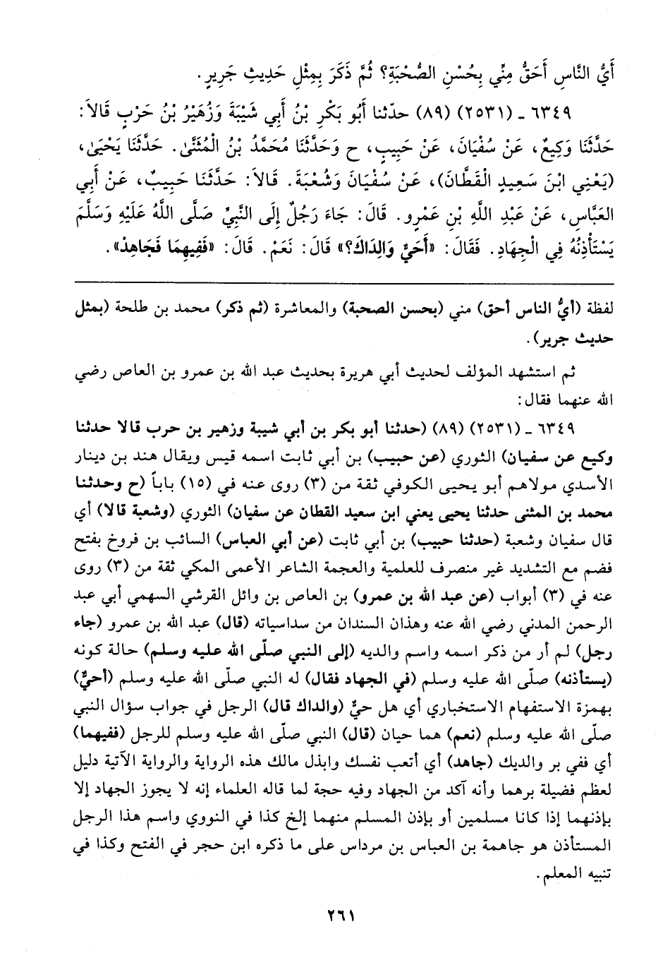 ٦٣٤٩ - (٢٥٣١) (٨٩) (حدثنا أبو بكر بن أبي شيبة وزهير بن حرب قالا حدثنا وكيع عن سفيان) الثوري (عن حبيب) بن أبي ثابت اسمه قيس ويقال هند بن دينار الأسدي مولاهم أبو يحيى الكوفي ثقة من (٣) روى عنه في (١٥) بابا (ح وحدثنا محمد بن المثنى حدثنا يحيى يعني ابن سعيد القطان عن سفيان) الثوري (وشعبة قالا) أي قال سفيان وشعبة (حدثنا حبيب) بن أبي ثابت (عن أبي العباس) السائب بن فروخ بفتح فضم مع التشديد غير منصرف للعلمية والعجمة الشاعر الأعمى المكي ثقة من (٣) روى عنه في (٣) أبواب (عن عبد الله بن عمرو) بن العاص بن وائل القرشي السهمي أبي عبد الرحمن المدني رضي الله عنه وهذان السندان من سداسياته (قال) عبد الله بن عمرو (جاء رجل) لم أر من ذكر اسمه واسم والديه (إلى النبي صلى الله عليه وسلم) حالة كونه (يستأذنه) صلى الله عليه وسلم (في الجهاد فقال) له النبي صلى الله عليه وسلم (أحيٌّ) بهمزة الاستفهام الاستخباري أي هل حيٌّ (والداك قال) الرجل في جواب سؤال النبي صلى الله عليه وسلم (نعم) هما حيان (قال) النبي صلى الله عليه وسلم للرجل (ففيهما) أي ففي بر والديك (جاهد) أي أتعب نفسك وابذل مالك هذه الرواية والرواية الآتية دليل لعظم فضيلة برهما وأنه آكد من الجهاد وفيه حجة لما قاله العلماء إنه لا يجوز الجهاد إلا بإذنهما إذا كانا مسلمين أو بإذن المسلم منهما إلخ كذا في النووي واسم هذا الرجل المستأذن هو جاهمة بن العباس بن مرداس على ما ذكره ابن حجر في الفتح وكذا في تنبيه المعلم.