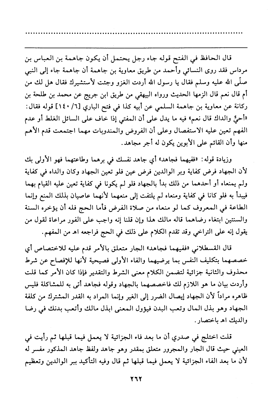 قال القسطلاني "ففيهما فجاهد" الجار متعلق بالأمر قدم عليه للاختصاص أي خصصهما بتكليف النفس بما يرضيهما والفاء الأولى فصيحية لأنها للإفصاح عن شرط محذوف والثانية جزائية لتضمن الكلام معنى الشرط والتقدير فإذا كان الأمر كما قلت وأردت بيان ما هو اللازم لك فاخصصهما بالجهاد وقوله فجاهد أتى به للمشاكلة فليس ظاهره مرادًا لأن الجهاد إيصال الضرر إلى الغير وإنما المراد به القدر المشترك من كلفة الجهاد وهو بذل المال وتعب البدن فيؤول المعنى ابذل مالك وأتعب بدنك في رضا والديك اهـ باختصار.