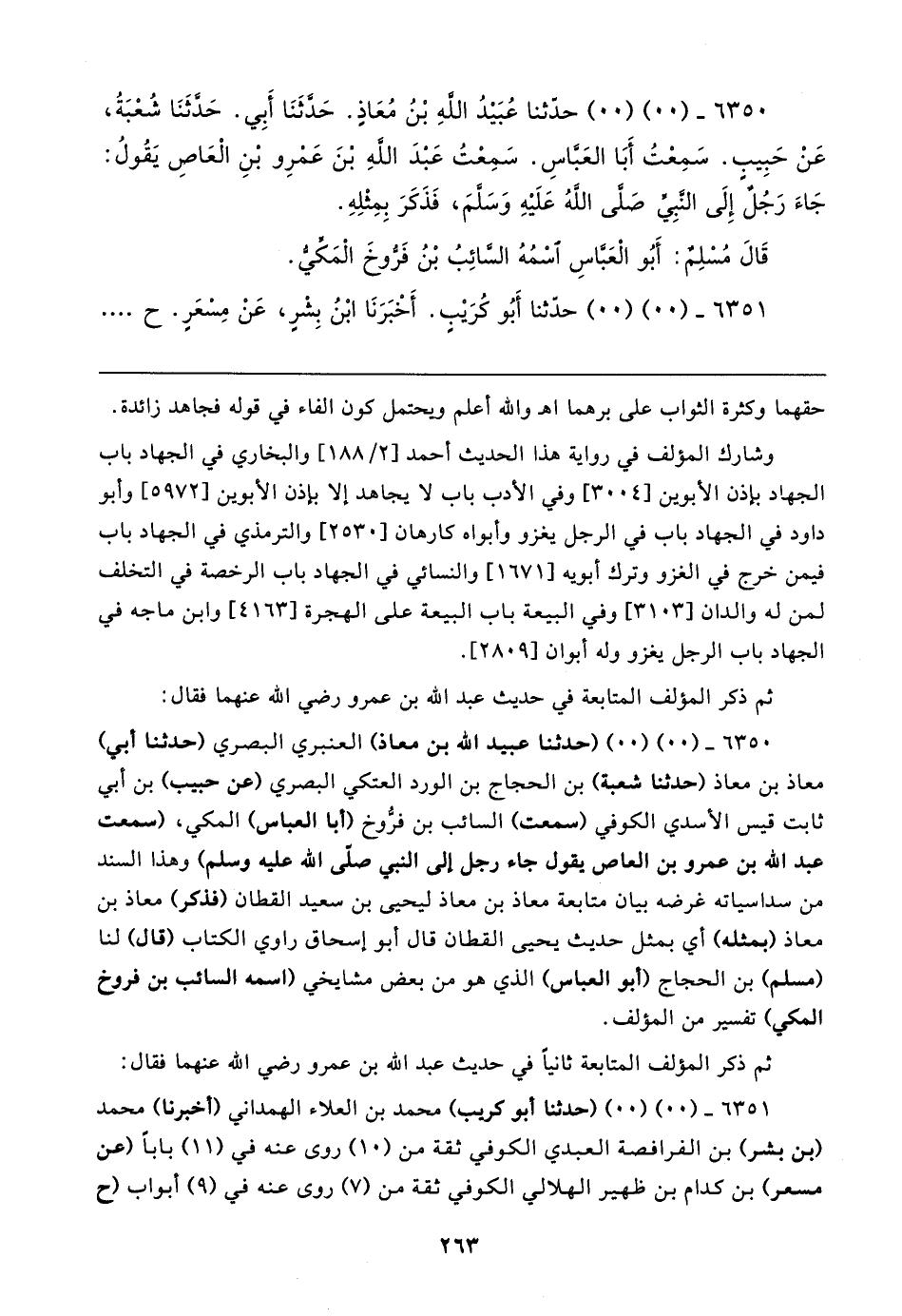٦٣٥٠ - (٠٠) (٠٠) (حدثنا عبيد الله بن معاذ) العنبري البصري (حدثنا أبي) معاذ بن معاذ (حدثنا شعبة) بن الحجاج بن الورد العتكي البصري (عن حبيب) بن أبي ثابت قيس الأسدي الكوفي (سمعت) السائب بن فرُّوخ (أبا العباس) المكي، (سمعت عبد الله بن عمرو بن العاص يقول جاء رجل إلى النبي صلى الله عليه وسلم) وهذا السند من سداسياته غرضه بيان متابعة معاذ بن معاذ ليحيى بن سعيد القطان (فذكر) معاذ بن معاذ (بمثله) أي بمثل حديث يحيى القطان قال أبو إسحاق راوي الكتاب (قال) لنا (مسلم) بن الحجاج (أبو العباس) الذي هو من بعض مشايخي (اسمه السائب بن فروخ المكي) تفسير من المؤلف.