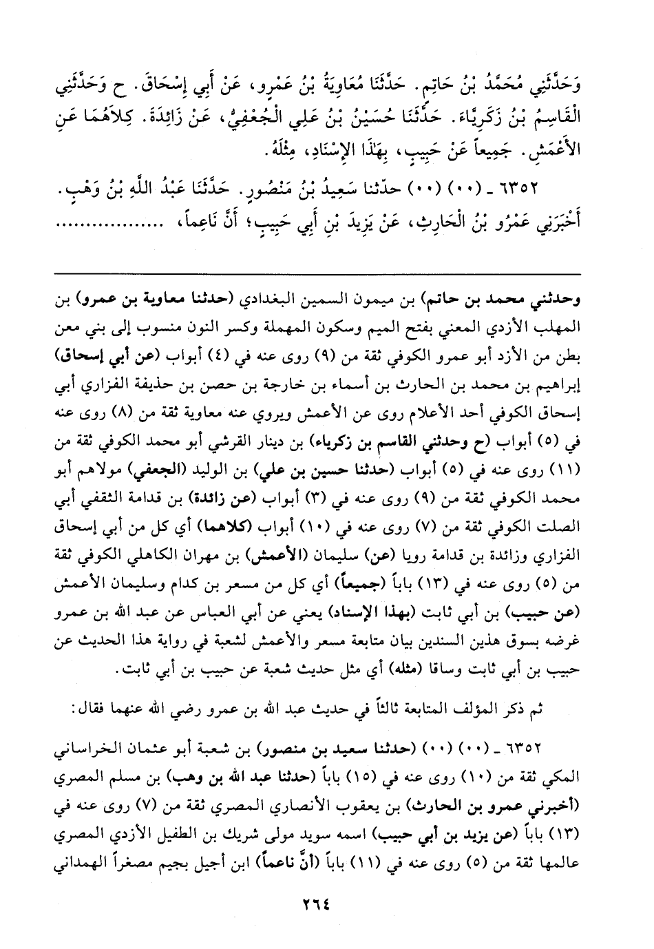 ٦٣٥٢ - (٠٠) (٠٠) (حدثنا سعيد بن منصور) بن شعبة أبو عثمان الخراساني المكي ثقة من (١٠) روى عنه في (١٠) بابا (حدثنا عبد الله بن وهب) بن مسلم المصري (أخبرني عمرو بن الحارث) بن يعقوب الأنصاري المصري ثقة من (٧) روى عنه في (١٣) بابا (عن يزيد بن أبي حبيب) اسمه سويد مولى شريك بن الطفيل الأزدي المصري عالمها ثقة من (٥) روى عنه في (١١) بابا (أن ناعمًا) ابن أجيل بجيم مصغرًا الهمداني