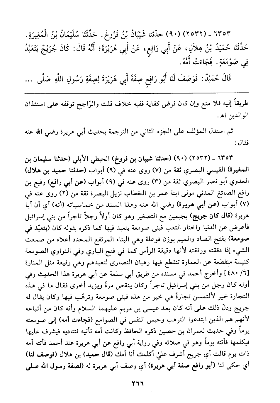 ٦٣٥٣ - (٢٥٣٢) (٩٠) حدَّثنا شَيبَانُ بْنُ فَرُّوخَ. حَدَّثَنَا سُلَيمَانُ بْنُ الْمُغِيرَةِ. حَدَّثَنَا حُمَيدُ بْنُ هِلالٍ، عَنْ أَبِي رَافِعٍ، عَنْ أَبِي هُرَيرَةَ؛ أَنَّهُ قَال: كَانَ جُرَيجٌ يَتَعَبَّدُ فِي صَوْمَعَةٍ. فَجَاءَتْ أُمُّهُ.