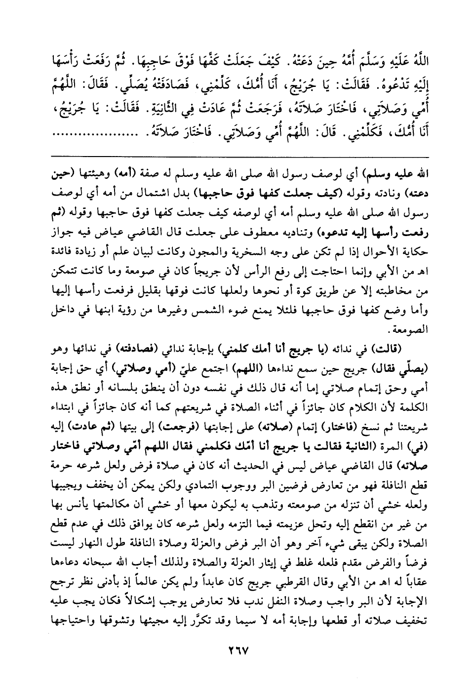 الله عَلَيهِ وَسَلَّمَ أُمَّهُ حِينَ دَعَتْهُ. كَيفَ جَعَلَتْ كَفَّهَا فَوْقَ حَاجِبِهَا. ثُمَّ رَفَعَتْ رَأْسَها إِلَيهِ تَدْعُوهُ. فَقَالتْ: يَا جُرَيجُ، أنَّا أُمُّكَ، كَلِّمْنِي، فَصَادَفَتْهُ يُصَلِّي. فَقَال: اللَّهُمَّ أُمِّي وَصَلاتِي، فَاخْتَارَ صَلاتَهُ، فَرَجَعَتْ ثُمَّ عَادَتْ فِي الثَّانِيَةِ. فَقَالتْ: يَا جُرَيجُ، أَنَا أُمُّكَ، فَكَلِّمْنِي. قَال: اللَّهُمَّ أُمِّي وَصَلاتِي. فَاخْتَارَ صَلاتَهُ