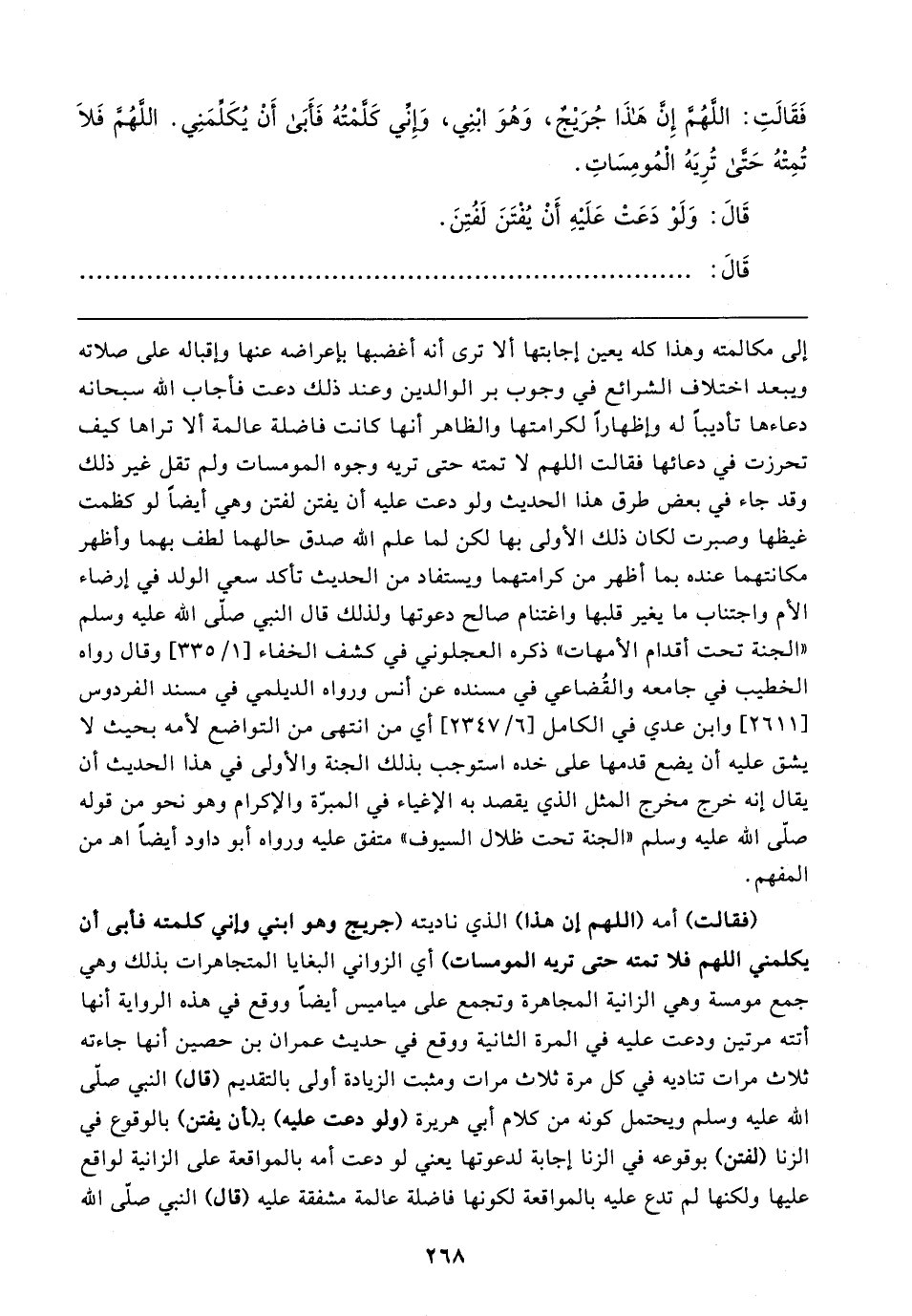 إلى مكالمته وهذا كله يعين إجابتها ألا ترى أنه أغضبها بإعراضه عنها وإقباله على صلاته ويبعد اختلاف الشرائع في وجوب بر الوالدين وعند ذلك دعت فأجاب الله سبحانه دعاءها تأديبًا له وإظهارًا لكرامتها والظاهر أنها كانت فاضلة عالمة ألا تراها كيف تحرزت في دعائها فقالت اللهم لا تمته حتى تريه وجوه المومسات ولم تقل غير ذلك وقد جاء في بعض طرق هذا الحديث ولو دعت عليه أن يفتن لفتن وهي أيضًا لو كظمت غيظها وصبرت لكان ذلك الأولى بها لكن لما علم الله صدق حالهما لطف بهما وأظهر مكانتهما عنده بما أظهر من كرامتهما ويستفاد من الحديث تأكد سعي الولد في إرضاء الأم واجتناب ما يغير قلبها واغتنام صالح دعوتها ولذلك قال النبي صلى الله عليه وسلم "الجنة تحت أقدام الأمهات" ذكره العجلوني في كشف الخفاء [١/ ٣٣٥] وقال رواه الخطيب في جامعه والقُضاعي في مسنده عن أنس ورواه الديلمي في مسند الفردوس [٢٦١١] وابن عدي في الكامل [٦/ ٢٣٤٧] أي من انتهى من التواضع لأمه بحيث لا يشق عليه أن يضع قدمها على خده استوجب بذلك الجنة والأولى في هذا الحديث أن يقال إنه خرج مخرج المثل الذي يقصد به الإغياء في المبرّة والإكرام وهو نحو من قوله صلى الله عليه وسلم "الجنة تحت ظلال السيوف" متفق عليه ورواه أبو داود أيضًا اهـ من المفهم.