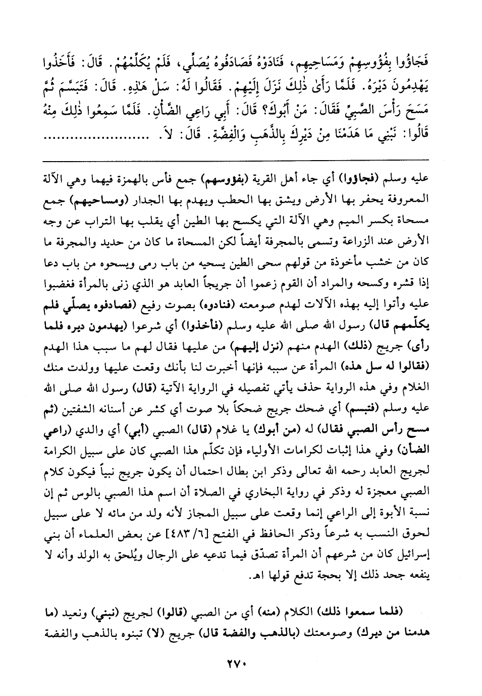 فَجَاؤُوا بِفُؤُوسِهِم وَمَسَاحِيهِم، فَنَادَوهُ فَصَادَفُوهُ يُصَلِّي، فَلَم يُكَلِّمهُم. قَال: فَأَخَذُوا يَهْدِمُونَ دَيرَهُ. فَلَما رَأَى ذلِكَ نَزَلَ إِلَيهِم. فَقَالُوا لَهُ: سَلْ هذِهِ. قَال: فَتَبسَّمَ ثُمَّ مَسَحَ رَأْسَ الصبِيِّ فَقَال: مَنْ أَبُوكَ؟ قَال: أَبِي رَاعِي الضأنِ. فَلَما سَمِعُوا ذلِكَ مِنْهُ قَالُوا: نَبْنِي مَا هدَمنَا مِنْ دَيرِكَ بِالذهبِ وَالْفِضةِ. قَال: لَا
