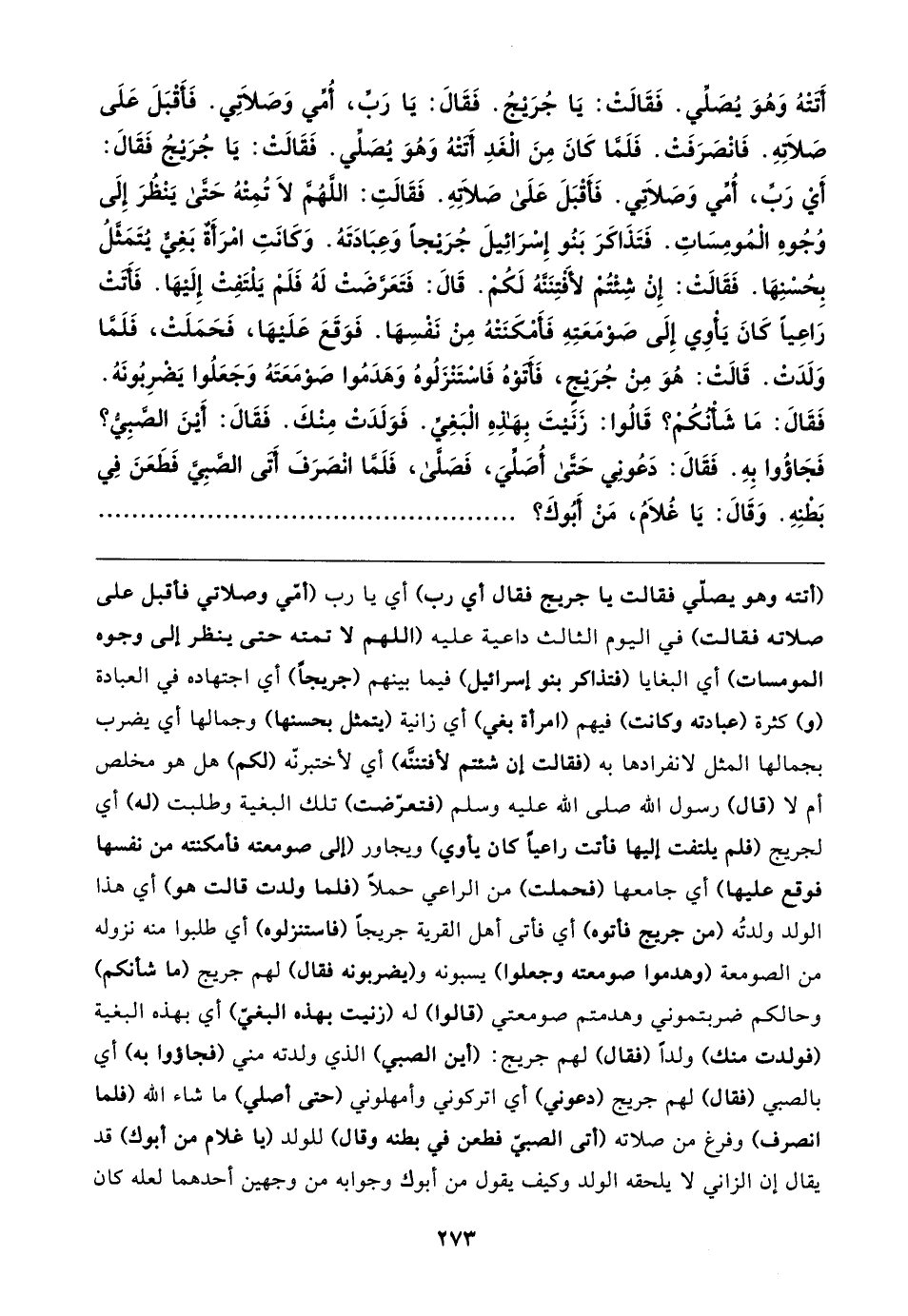 أتتْهُ وَهُوَ يُصَلِّي. فَقَالتْ: يَا جُرَيجُ. فَقَال: يَا رَبِّ، أُمِّي وَصَلاتِي. فَأَقْبَلَ عَلَى صَلاتهِ. فَانْصَرَفَتْ. فَلَمَّا كَانَ مِنَ الْغَدِ أتَتْهُ وَهُوَ يُصَلِّي. فَقَالتْ: يَا جُرَيجُ فَقَال: أَي رَبِّ، أُمِّي وَصَلاتِي. فَأَقْبَلَ عَلَى صَلاتهِ. فَقَالتِ: اللَّهُمَّ لَا تُمِتْهُ حَتَّى يَنْظُرَ إِلَى وُجُوهِ الْمُومِسَاتِ. فَتَذَاكَرَ بَنُو إِسْرَائِيلَ جُرَيجًا وَعِبَادَتَهُ. وَكَانَتِ امْرَأَةْ بَغِيٌّ يُتَمَثَّلُ بِحُسْنِهَا. فَقَالتْ: إِنْ شِئْتُم لأَفْتِنَنَّهُ لَكُمْ. قَال: فَتَعَرَّضَتْ لَهُ فَلَمْ يَلْتَفِتْ إِلَيهَا. فَأَتتْ رَاعِيًا كَانَ يَأْوي إِلَى صوْمَعَتِهِ فَأَمْكَنَتْهُ مِنْ نَفْسِهَا. فَوَقَعَ عَلَيهَا، فَحَمَلَتْ، فَلَمَّا وَلَدَتْ. قَالتْ: هُوَ مِنْ جُرَيجٍ، فَأَتوْهُ فَاسْتَنْزَلُوهُ وَهَدَمُوا صَوْمَعَتَهُ وَجَعَلُوا يَضْرِبُونَهُ. فَقَال: مَا شَأْنُكُمْ؟ قَالُوا: زَنَيتَ بِهَذِهِ الْبَغِيِّ. فَوَلَدَتْ مِنْكَ. فَقَال: أَينَ الصَّبِيُّ؟ فَجَاؤُوا بِهِ. فَقَال: دَعُونِي حَتَّى أُصَلِّيَ، فَصَلَّى، فَلَمَّا انْصَرَفَ أَتَى الصَّبِيَّ فَطَعَنَ فِي بَطْنِهِ. وَقَال: يَا غُلامُ، مَنْ أَبُوكَ؟