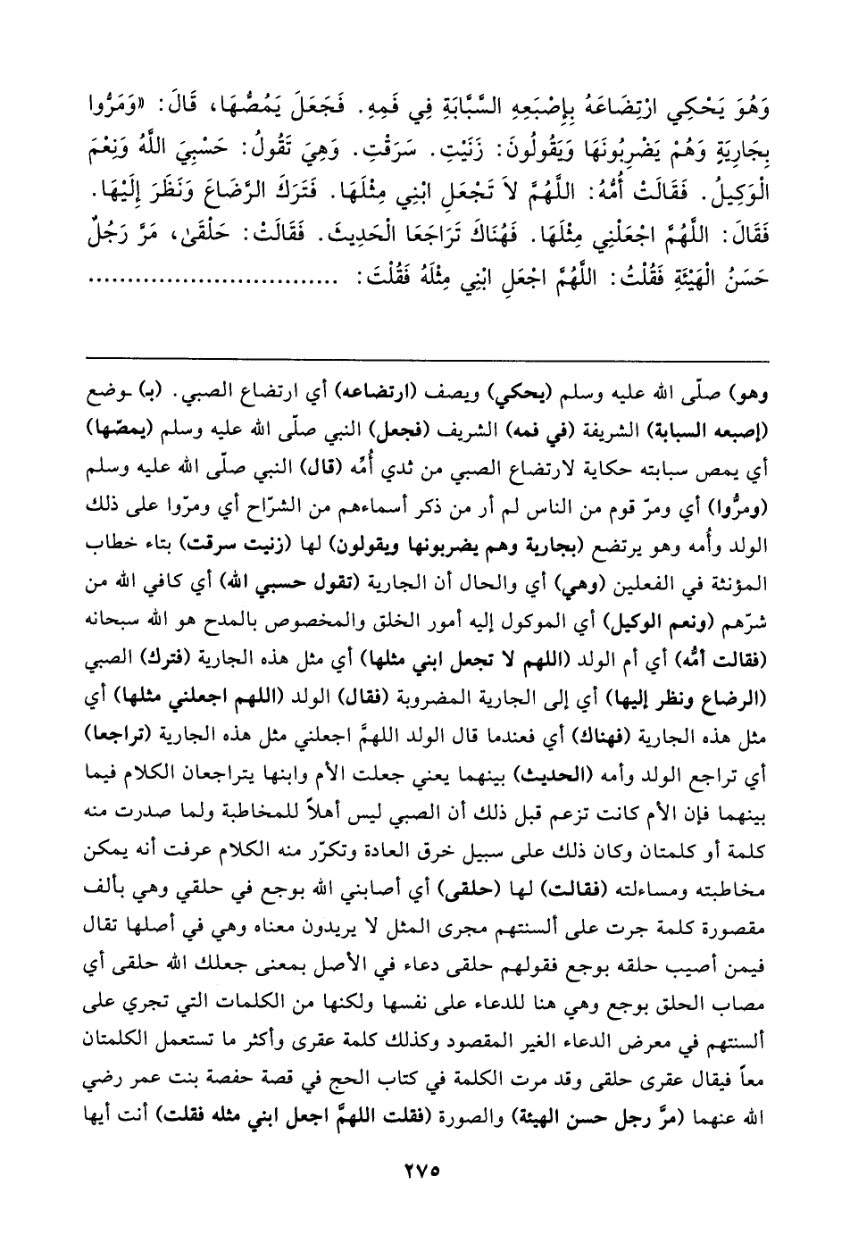 وهو) صلى الله عليه وسلم (يحكي) ويصف (ارتضاعه) أي ارتضاع الصبي. (بـ) ـوضع (إصبعه السبابة) الشريفة (في فمه) الشريف (فجعل) النبي صلَّى الله عليه وسلم (يمصّها) أي يمص سبابته حكاية لارتضاع الصبي من ثدي أُمِّه (قال) النبي صلى الله عليه وسلم (ومرُّوا) أي ومرّ قوم من الناس لم أر من ذكر أسماءهم من الشرّاح أي ومرّوا على ذلك الولد وأُمه وهو يرتضع (بجاربة وهم يضربونها ويقولون) لها (زنيت سرقت) بتاء خطاب المؤنثة في الفعلين (وهي) أي والحال أن الجارية (تقول حسبي الله) أي كافي الله من شرّهم (ونعم الوكيل) أي الموكول إليه أمور الخلق والمخصوص بالمدح هو الله سبحانه (فقالت أمُّه) أي أم الولد (اللهم لا تجعل ابني مثلها) أي مثل هذه الجارية (فترك) الصبي (الرضاع ونظر إليها) أي إلى الجارية المضروبة (فقال) الولد (اللهم اجعلني مثلها) أي مثل هذه الجارية (فهناك) أي فعندما قال الولد اللهمَّ اجعلني مثل هذه الجارية (تراجعا) أي تراجع الولد وأمه (الحديث) بينهما يعني جعلت الأم وابنها يتراجعان الكلام فيما بينهما فإن الأم كانت تزعم قبل ذلك أن الصبي ليس أهلًا للمخاطبة ولما صدرت منه كلمة أو كلمتان وكان ذلك على سبيل خرق العادة وتكرّر منه الكلام عرفت أنه يمكن مخاطبته ومساءلته (فقالت) لها (حلقى) أي أصابني الله بوجع في حلقي وهي بالف مقصورة كلمة جرت على ألسنتهم مجرى المثل لا يريدون معناه وهي في أصلها تقال فيمن أصيب حلقه بوجع فقولهم حلقى دعاء في الأصل بمعنى جعلك الله حلقى أي مصاب الحلق بوجع وهي هنا للدعاء على نفسها ولكنها من الكلمات التي تجري على ألسنتهم في معرض الدعاء الغير المقصود وكذلك كلمة عقرى وأكثر ما تستعمل الكلمتان معًا فيقال عقرى حلقى وقد مرت الكلمة في كتاب الحج في قصة حفصة بنت عمر رضي الله عنهما (مرَّ رجل حسن الهيئة) والصورة (فقلت اللهم اجعل ابني مثله فقلت) أنت أيها