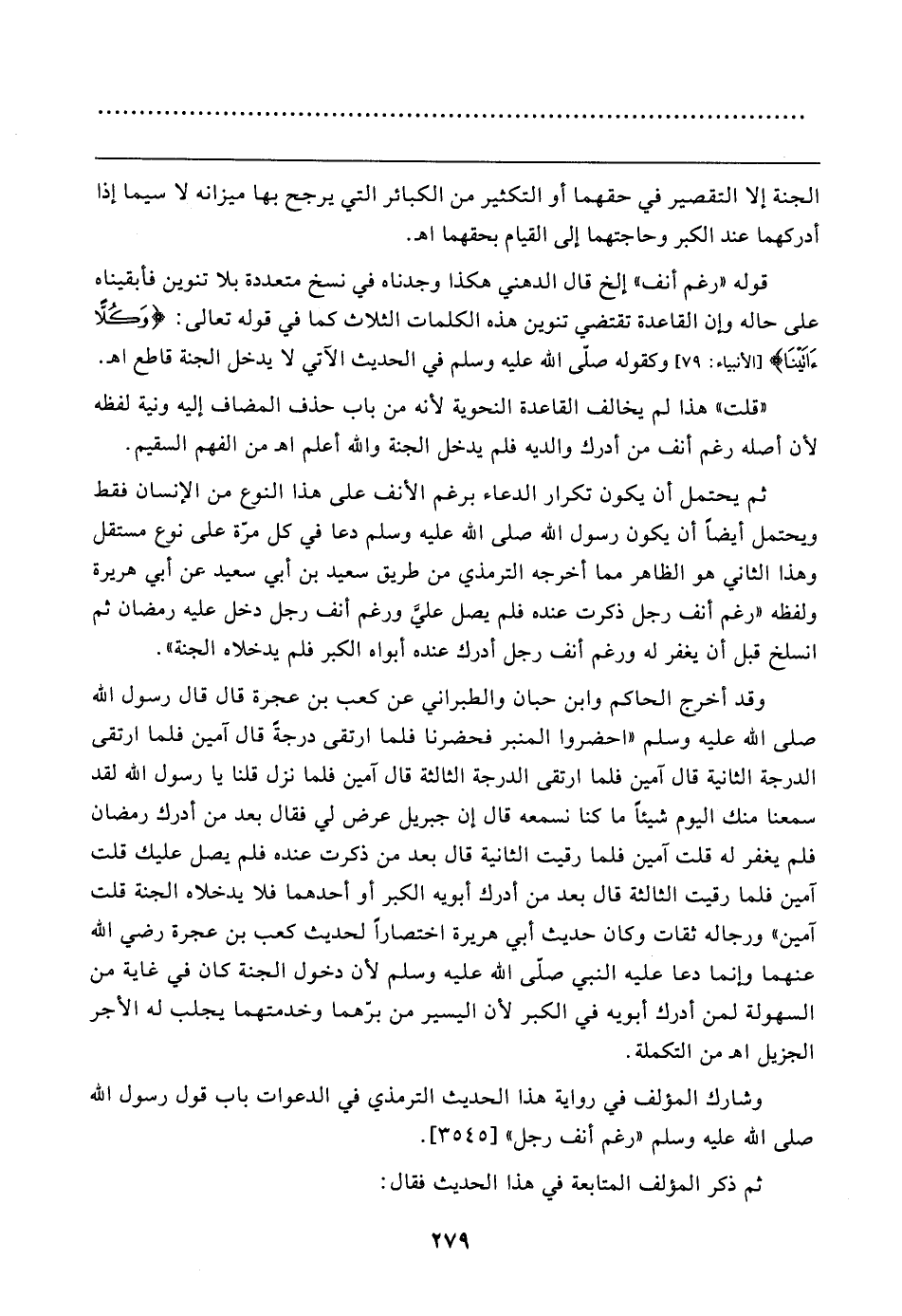 وقد أخرج الحاكم وابن حبان والطبراني عن كعب بن عجرة قال قال رسول الله صلى الله عليه وسلم "احضروا المنبر فحضرنا فلما ارتقى درجةً قال آمين فلما ارتقى الدرجة الثانية قال آمين فلما ارتقى الدرجة الثالثة قال آمين فلما نزل قلنا يا رسول الله لقد سمعنا منك اليوم شيئًا ما كنا نسمعه قال إن جبريل عرض لي فقال بعد من أدرك رمضان فلم يغفر له قلت آمين فلما رقيت الثانية قال بعد من ذكرت عنده فلم يصل عليك قلت آمين فلما رقيت الثالثة قال بعد من أدرك أبويه الكبر أو أحدهما فلا يدخلاه الجنة قلت آمين" ورجاله ثقات وكان حديث أبي هريرة اختصارًا لحديث كعب بن عجرة رضي الله عنهما وإنما دعا عليه النبي صلى الله عليه وسلم لأن دخول الجنة كان في غاية من السهولة لمن أدرك أبويه في الكبر لأن اليسير من برّهما وخدمتهما يجلب له الأجر الجزيل اهـ من التكملة.