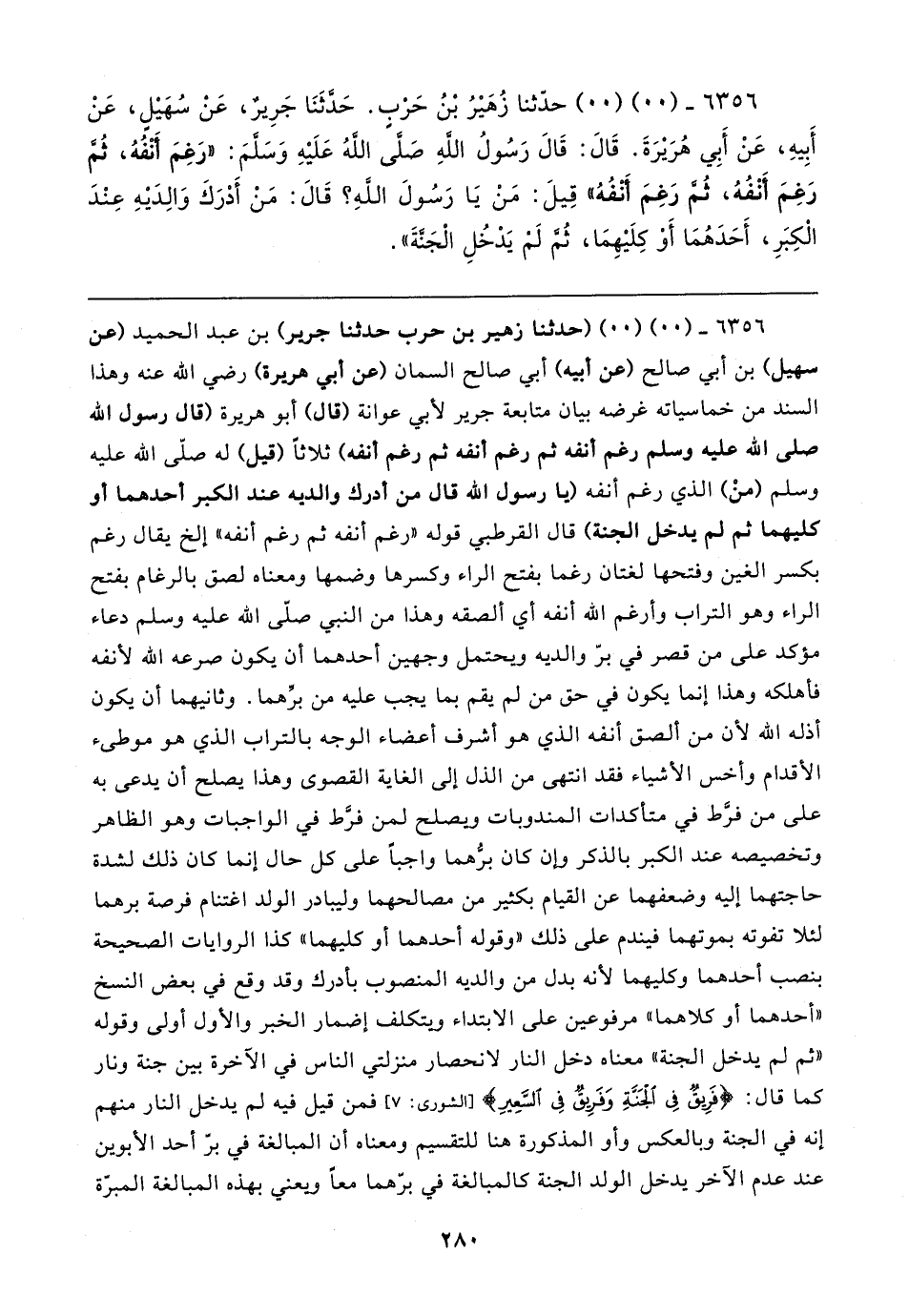 ٦٣٥٦ - (٠٠) (٠٠) (حدثنا زهير بن حرب حدثنا جرير) بن عبد الحميد (عن سهيل) بن أبي صالح (عن أبيه) أبي صالح السمان (عن أبي هريرة) رضي الله عنه وهذا السند من خماسياته غرضه بيان متابعة جرير لأبي عوانة (قال) أبو هريرة (قال رسول الله صلى الله عليه وسلم رغم أنفه ثم رغم أنفه ثم رغم أنفه) ثلاثًا (قيل) له صلى الله عليه وسلم (منْ) الذي رغم أنفه (يا رسول الله قال من أدرك والديه عند الكبر أحدهما أو كليهما ثم لم يدخل الجنة) قال القرطبي قوله "رغم أنفه ثم رغم أنفه" إلخ يقال رغم بكسر الغين وفتحها لغتان رغما بفتح الراء وكسرها وضمها ومعناه لصق بالرغام بفتح الراء وهو التراب وأرغم الله أنفه أي ألصقه وهذا من النبي صلى الله عليه وسلم دعاء مؤكد على من قصر في برّ والديه ويحتمل وجهين أحدهما أن يكون صرعه الله لأنفه فأهلكه وهذا إنما يكون في حق من لم يقم بما يجب عليه من برِّهما. وثانيهما أن يكون أذله الله لأن من ألصق أنفه الذي هو أشرف أعضاء الوجه بالتراب الذي هو موطئ الأقدام وأخس الأشياء فقد انتهى من الذل إلى الغاية القصوى وهذا يصلح أن يدعى به على من فرَّط في متأكدات المندوبات ويصلح لمن فرَّط في الواجبات وهو الظاهر وتخصيصه عند الكبر بالذكر وإن كان برهما واجبًا على كل حال إنما كان ذلك لشدة حاجتهما إليه وضعفهما عن القيام بكثير من مصالحهما وليبادر الولد اغتنام فرصة برهما لئلا تفوته بموتهما فيندم على ذلك "وقوله أحدهما أو كليهما" كذا الروايات الصحيحة بنصب أحدهما وكليهما لأنه بدل من والديه المنصوب بأدرك وقد وقع في بعض النسخ "أحدهما أو كلاهما" مرفوعين على الابتداء ويتكلف إضمار الخبر والأول أولى وقوله "ثم لم يدخل الجنة" معناه دخل النار لانحصار منزلتي الناس في الآخرة بين جنة ونار كما قال: {فَرِيقٌ فِي الْجَنَّةِ وَفَرِيقٌ فِي السَّعِير} [الشورى: ٧] فمن قيل فيه لم يدخل النار منهم إنه في الجنة وبالعكس وأو المذكورة هنا للتقسيم ومعناه أن المبالغة في برّ أحد الأبوين عند عدم الآخر يدخل الولد الجنة كالمبالغة في برّهما معًا ويعني بهذه المبالغة المبرّة