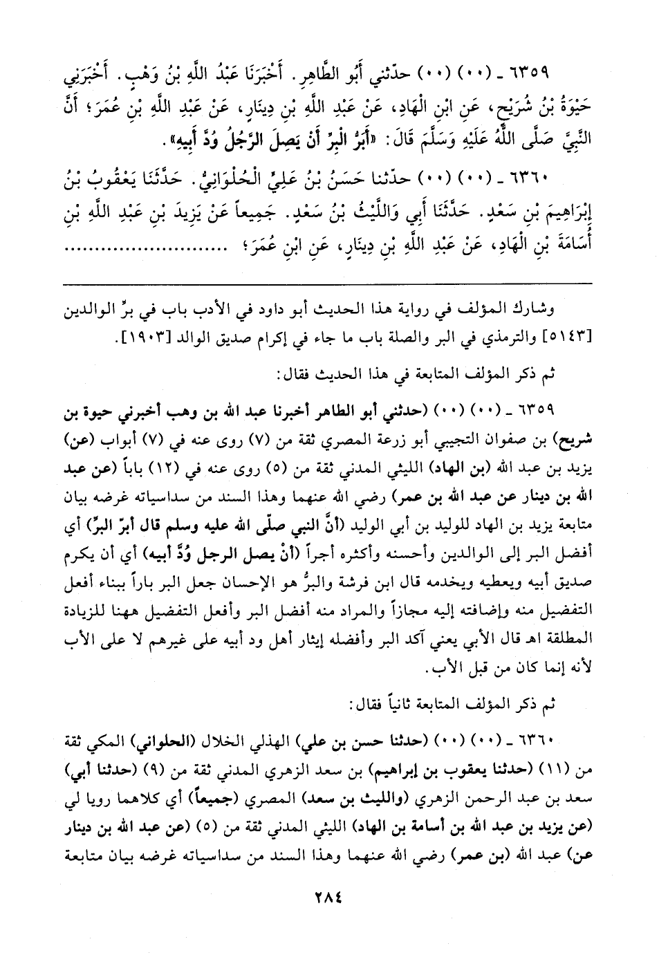 ٦٣٥٩ - (٠٠) (٠٠) حدّثني أَبُو الطَّاهِرِ. أَخْبَرَنَا عَبْدُ اللهِ بْنُ وَهْبٍ. أَخْبَرَنِي حَيوَةُ بْنُ شُرَيحٍ، عَنِ ابْنِ الْهَادِ، عَنْ عَبْدِ اللهِ بْنِ دِينَارٍ، عَنْ عَبْدِ اللهِ بْنِ عُمَرَ؛ أَنَّ النَّبِيَّ صَلَّى اللهُ عَلَيهِ وَسَلَّمَ قَال: "أَبَرُّ الْبِرِّ أَنْ يَصِلَ الرَّجُلُ وُدَّ أَبِيهِ".