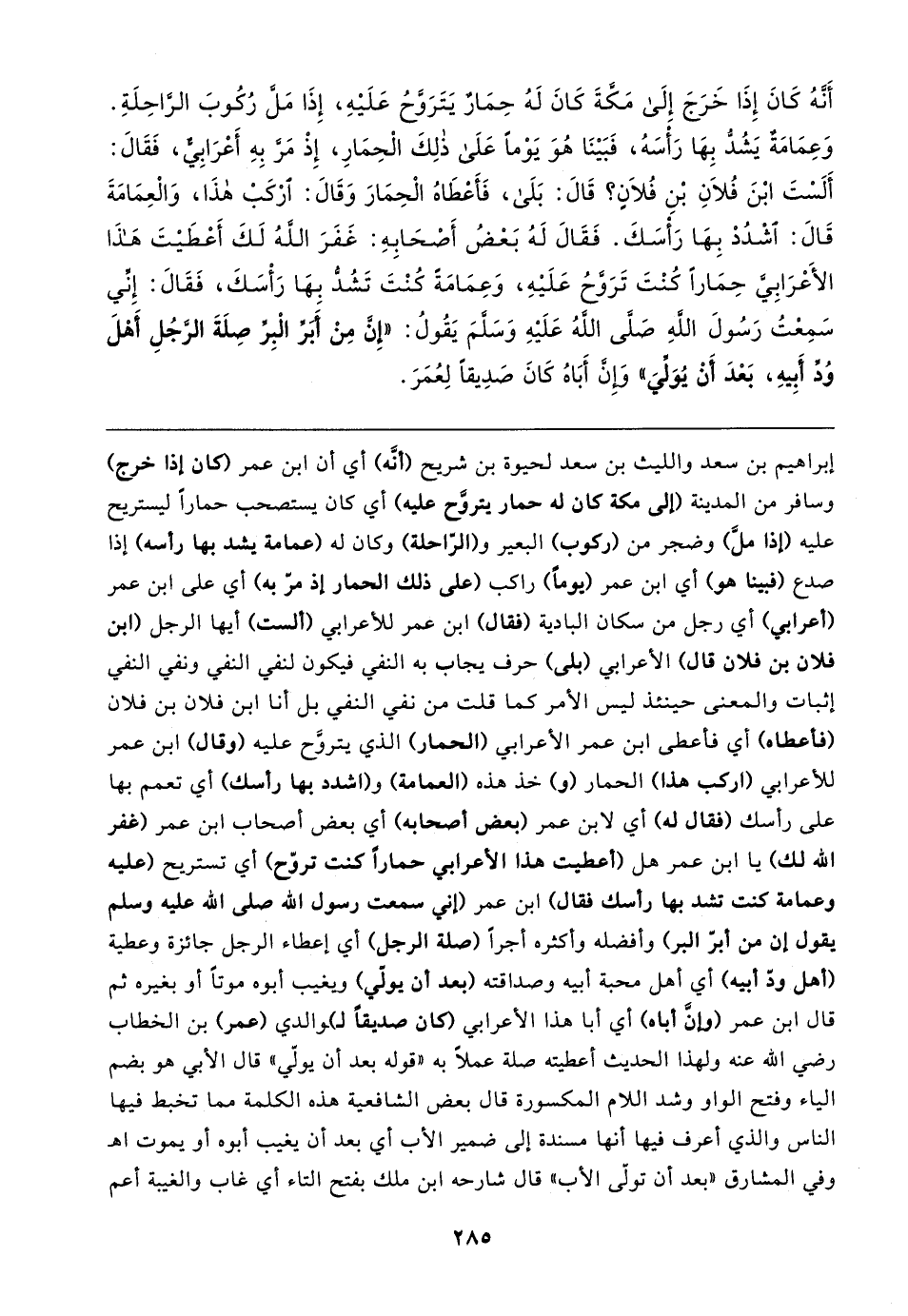 إبراهيم بن سعد والليث بن سعد لحيوة بن شريح (أنَّه) أي أن ابن عمر (كان إذا خرج) وسافر من المدينة (إلى مكة كان له حمار يتروح عليه) أي كان يستصحب حمارًا ليستريح عليه (إذا ملَّ) وضجر من (ركوب) البعير و (الرَّاحلة) وكان له (عمامة يشد بها رأسه) إذا صدع (فبينا هو) أي ابن عمر (يومًا) راكب (على ذلك الحمار إذ مرّ به) أي على ابن عمر (أعرابي) أي رجل من سكان البادية (فقال) ابن عمر للأعرابي (ألست) أيها الرجل (ابن فلان بن فلان قال) الأعرابي (بلى) حرف يجاب به النفي فيكون لنفي النفي ونفي النفي إثبات والمعنى حينئذ ليس الأمر كما قلت من نفي النفي بل أنا ابن فلان بن فلان (فأعطاه) أي فأعطى ابن عمر الأعرابي (الحمار) الذي يتروَّح عليه (وقال) ابن عمر للأعرابي (اركب هذا) الحمار (و) خذ هذه (العمامة) و (اشدد بها رأسك) أي تعمم بها على رأسك (فقال له) أي لابن عمر (بعض أصحابه) أي بعض أصحاب ابن عمر (غفر الله لك) يا ابن عمر هل (أعطيت هذا الأعرابي حمارًا كنت تروّح) أي تستريح (عليه وعمامة كنت تشد بها رأسك فقال) ابن عمر (إني سمعت رسول الله صلى الله عليه وسلم يقول إن من أبرّ البر) وأفضله وأكثره أجرًا (صلة الرجل) أي إعطاء الرجل جائزة وعطية (أهل ودّ أبيه) أي أهل محبة أبيه وصداقته (بعد أن يولّي) ويغيب أبوه موتًا أو بغيره ثم قال ابن عمر (وإنَّ أباه) أي أبا هذا الأعرابي كان صديقًا لـ) ـوالدي (عمر) بن الخطاب رضي الله عنه ولهذا الحديث أعطيته صلة عملًا به "قوله بعد أن يولّي " قال الأبي هو بضم الياء وفتح الواو وشد اللام المكسورة قال بعض الشافعية هذه الكلمة مما تخبط فيها الناس والذي أعرف فيها أنها مسندة إلى ضمير الأب أي بعد أن يغيب أبوه أو يموت اهـ وفي المشارق "بعد أن تولّى الأب" قال شارحه ابن ملك بفتح التاء أي غاب والغيبة أعم