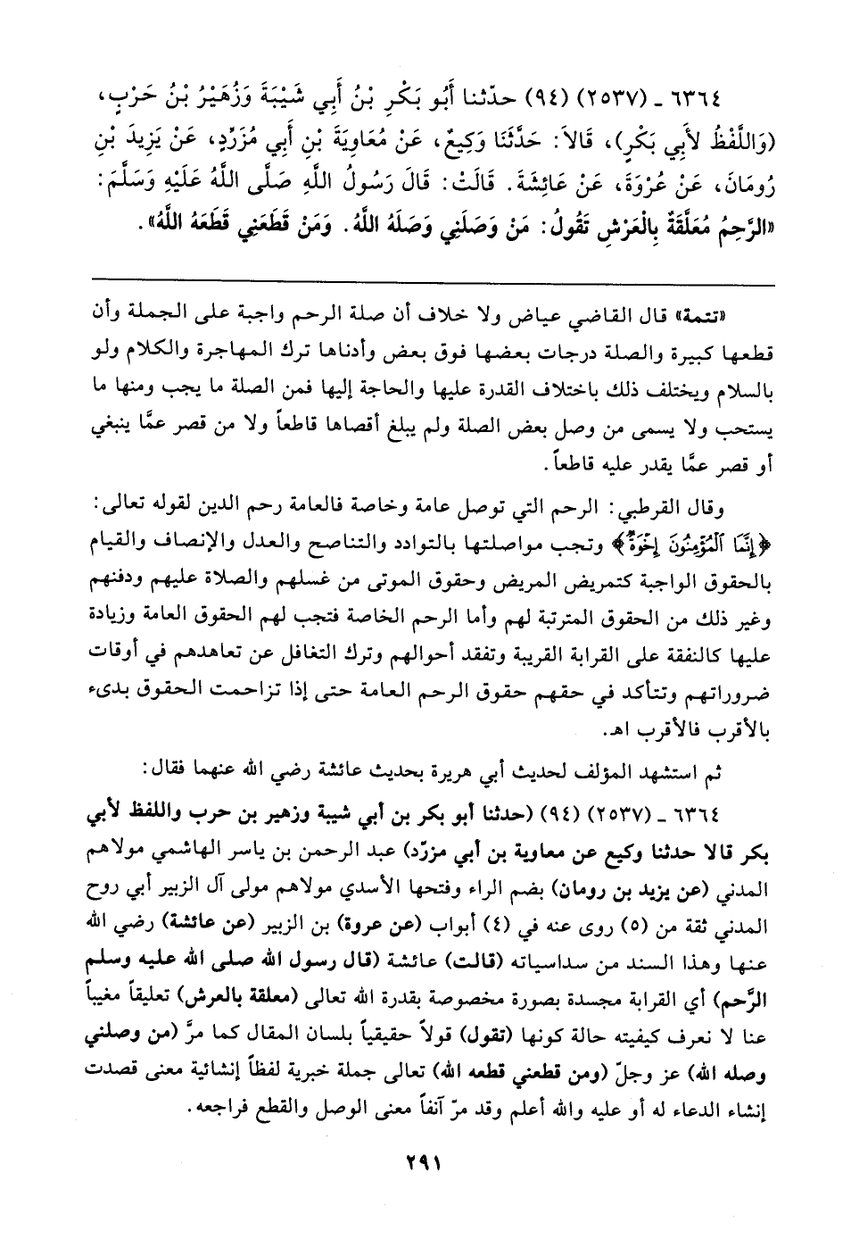 ٦٣٦٤ - (٢٥٣٧) (٩٤) حدَّثنا أَبُو بَكْرِ بْنُ أَبِي شَيبَةَ وَزُهَيرُ بْنُ حَرْبٍ، (وَاللَّفْظُ لأبَي بَكْرٍ)، قَالا: حَدَّثَنَا وَكِيعٌ، عَنْ مُعَاوَيةَ بْنِ أَبِي مُزَرِّدٍ، عَنْ يَزِيدَ بْنِ رُومَانَ، عَنْ عُرْوَةَ، عَنْ عَائِشَةَ. قَالتْ: قَال رَسُولُ اللهِ صَلَّى اللهُ عَلَيهِ وَسَلَّمَ: "الرَّحِمُ مُعَلَّقَةٌ بِالْعَرْشِ تَقُولُ: مَنْ وَصَلَني وَصَلَهُ اللهُ. وَمَنْ قَطَعَنِي قَطَعَهُ اللهُ"