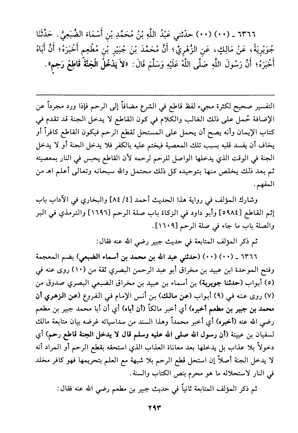 ٦٣٦٦ - (٠٠) (٠٠) حدّثني عَبْدُ اللهِ بْنُ مُحَمَّدٍ بْنِ أَسْمَاءَ الضُّبَعِيُّ. حَدَّثَنَا جُوَيرِيَةُ، عَنْ مَالِكٍ، عَنِ الزُّهْرِيِّ؛ أَنَّ مُحَمَّدَ بْنَ جُبَيرِ بْنِ مُطْعِمٍ أَخْبَرَهُ؛ أَنَّ أَبَاهُ أَخْبَرَهُ؛ أَنَّ رَسُولَ اللهِ صَلَّى اللهُ عَلَيهِ وَسَلَّمَ قَال: "لَا يَدْخُلُ الْجَنَّةَ قَاطِعُ رَحِمٍ"