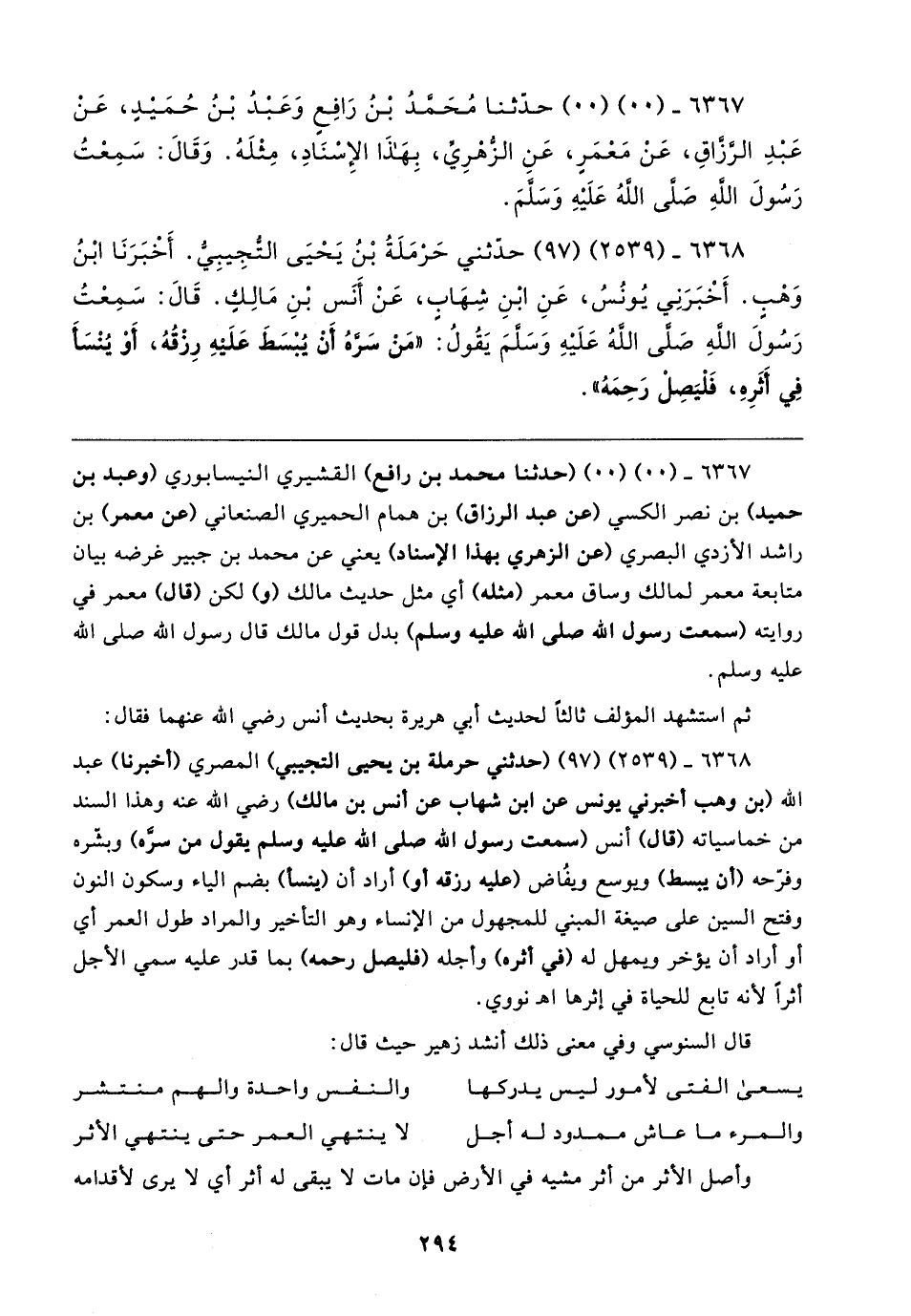 ٦٣٦٨ - (٢٥٣٩) (٩٧) حدّثني حَرْمَلَةُ بْنُ يَحْيَى التُّجِيبِيُّ. أَخْبَرَنَا ابْنُ وَهْبٍ. أَخْبَرَنِي يُونُسُ، عَنِ ابْنِ شِهَابٍ، عَنْ أَنَس بْنِ مَالِكٍ. قَال: سَمِعْتُ رَسُولَ اللهِ صَلَّى اللهُ عَلَيهِ وَسَلَّمَ يَقُولُ: "مَنْ سَرَّهُ أَنْ يُبْسَطَ عَلَيهِ رِزْقُهُ، أَوْ يُنْسَأ فِي أَثَرِهِ، فَلْيَصِلْ رَحِمَهُ"