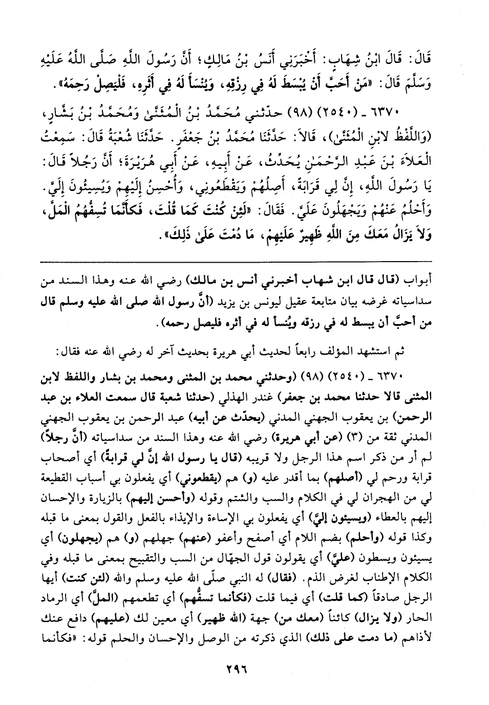 قَال: قَال ابْنُ شِهَابٍ: أَخبَرَنِي أَنسُ بْنُ مَالِكٍ؛ أَنَّ رَسُولَ اللهِ صَلَّى اللهُ عَلَيهِ وَسَلَّمَ قَال: "مَنْ أَحَبَّ أَنْ يُبْسَطَ لَهُ فِي رِزْقِهِ، وَيُنْسَأَ لَهُ فِي أَثَرِهِ، فَلْيَصِلْ رَحِمَهُ".