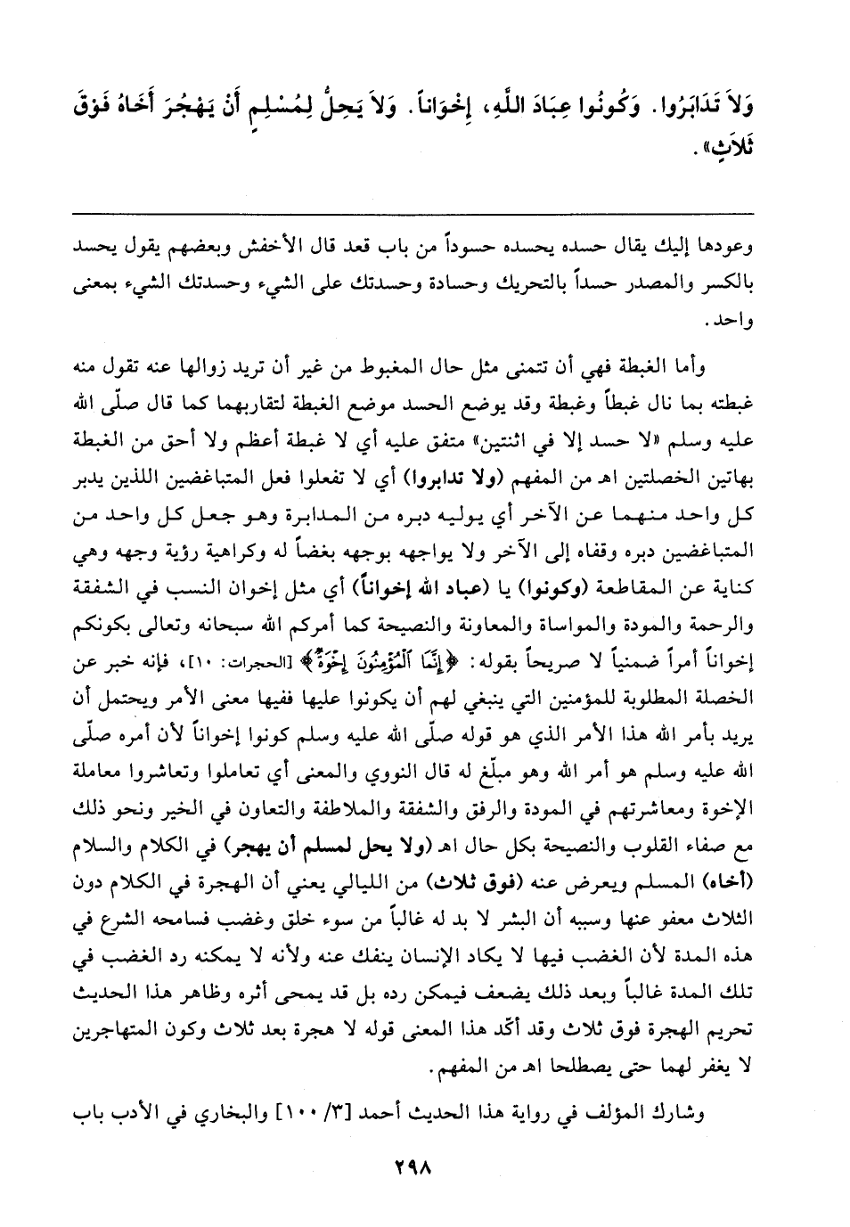 وَلَا تَدَابَرُوا. وَكُونُوا عِبَادَ اللهِ، إِخْوَانًا. وَلَا يَحِلُّ لِمُسْلِمٍ أَنْ يَهْجُرَ أَخَاهُ فَوْقَ ثَلاثٍ"