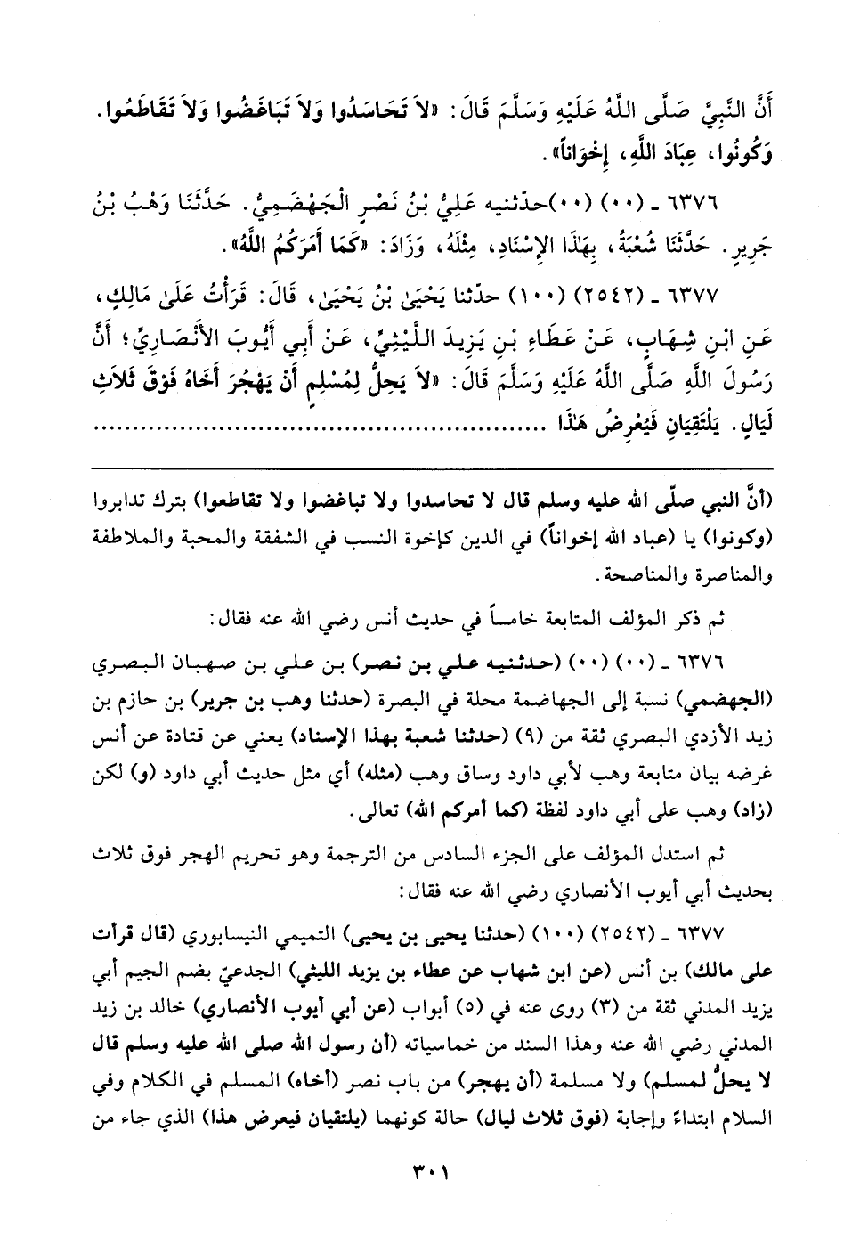 ٦٣٧٧ - (٢٥٤٢) (١٠٠) حدَّثنا يَحْيَى بْنُ يَحْيَى، قَال: قَرَأْتُ عَلَى مَالِكٍ، عَنِ ابْنِ شِهَابٍ، عَنْ عَطَاءِ بْنِ يَزِيدَ اللَّيثِيِّ، عَنْ أَبِي أَيُّوبَ الأَنْصَارِيِّ؛ أَنَّ رَسُولَ اللهِ صَلَّى اللهُ عَلَيهِ وَسَلَّمَ قَال: "لَا يَحِل لِمُسْلِمٍ أَنْ يَهْجُرَ أَخَاهُ فَوْقَ ثَلاثِ لَيَالٍ. يَلْتَقِيَانِ فَيُعْرِضُ هَذَا