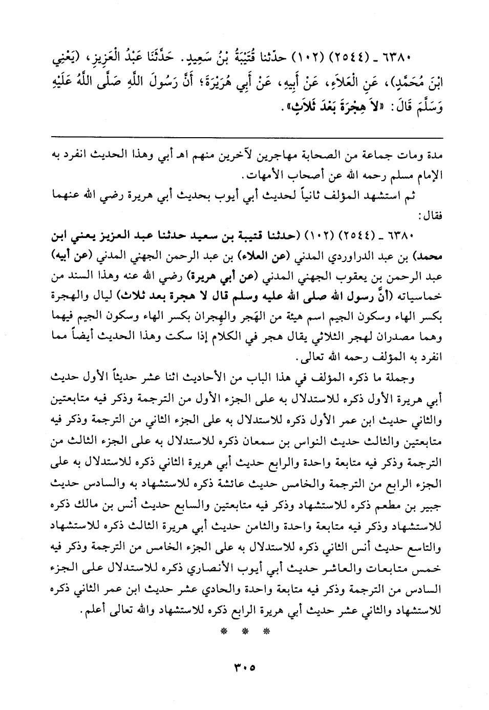 ٦٣٨٠ - (٢٥٤٤) (١٠٢) حدَّثنا قُتَيبَةُ بْنُ سَعِيدٍ. حَدَّثَنَا عَبْدُ الْعَزِيزِ، (يَعْنِي ابْنَ مُحَمَّدٍ)، عَنِ الْعَلاءِ، عَنْ أَبِيهِ، عَنْ أَبِي هُرَيرَةَ؛ أَنَّ رَسُولَ اللهِ صَلَّى اللهُ عَلَيهِ وَسَلَّمَ قَال: "لَا هِجْرَةَ بَعْدَ ثَلاثٍ"