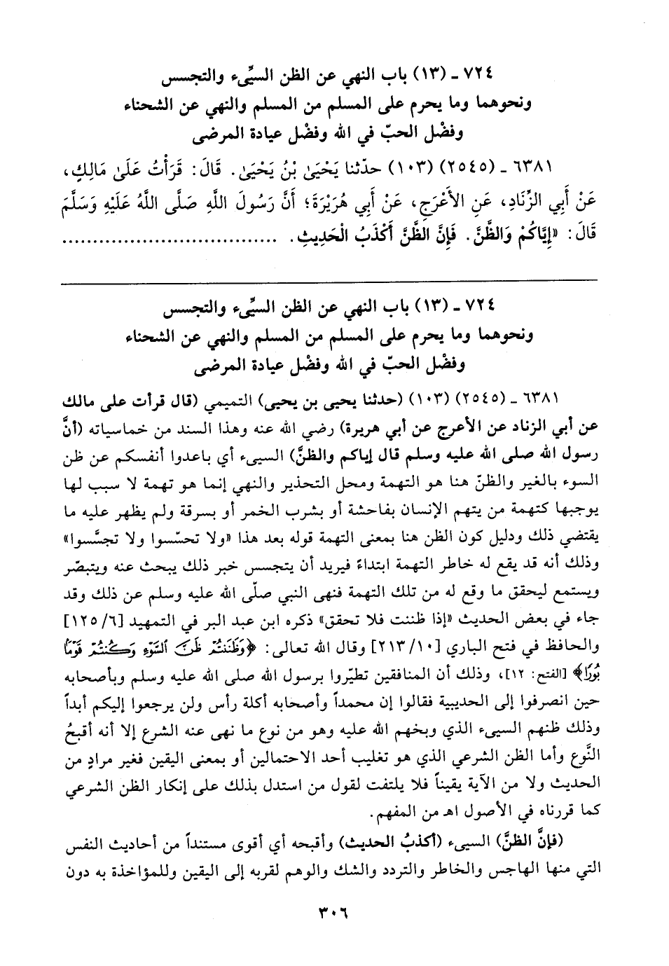 ٦٣٨١ - (٢٥٤٥) (١٠٣) حدَّثنا يَحْيَى بْنُ يَحْيَى. قَال: قَرَأْتُ عَلَى مَالِكٍ، عَنْ أَبِي الزِّنَادِ، عَنِ الأعرَجِ، عَنْ أَبِي هُرَيرَةَ؛ أَنَّ رَسُولَ اللهِ صَلَّى اللهُ عَلَيهِ وَسَلَّمَ قَال: "إِيَّاكُمْ وَالظَّنَّ. فَإِنَّ الظَّنَّ أَكْذَبُ الْحَدِيثِ