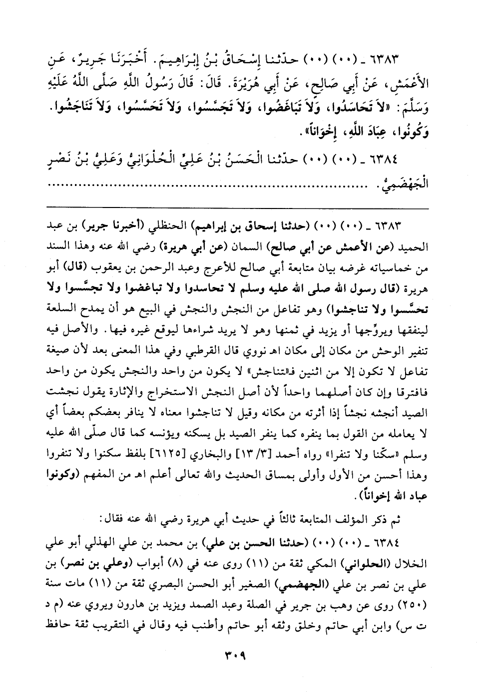 ٦٣٨٣ - (٠٠) (٠٠) حدَّثنا إِسْحَاقُ بْنُ إِبْرَاهِيمَ. أَخْبَرَنَا جَرِيرٌ، عَنِ الأعمَشِ، عَنْ أَبِي صَالِحٍ، عَنْ أَبِي هُرَيرَةَ. قَال: قَال رَسُولُ اللهِ صَلَّى اللهُ عَلَيهِ وَسَلَّمَ: "لَا تَحَاسَدُوا، وَلَا تَبَاغَضُوا، وَلَا تَجَسَّسُوا، وَلَا تَحَسَّسُوا، وَلَا تَنَاجَشُوا. وَكُونُوا، عِبَادَ اللهِ، إِخْوَانًا".