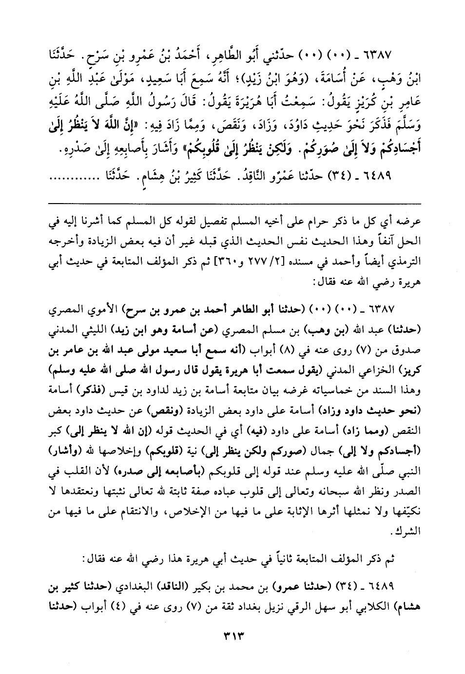 ٦٣٨٧ - (٠٠) (٠٠) (حدثنا أبو الطاهر أحمد بن عمرو بن سرح) الأموي المصري (حدثنا) عبد الله (بن وهب) بن مسلم المصري (عن أسامه وهو ابن زيد) الليثي المدني صدوق من (٧) روى عنه في (٨) أبواب (أنه سمع أبا سعيد مولى عبد الله بن عامر بن كريز) الخزاعي المدني (يقول سمعت أبا هريرة يقول قال رسول الله صلى الله عليه وسلم) وهذا السند من خماسياته غرضه بيان متابعة أسامة بن زيد لداود بن قيس (فذكر) أسامة (نحو حديث داود وزاد) أسامة على داود بعض الزيادة (ونقص) عن حديث داود بعض النقص (ومما زاد) أسامة على داود (فيه) أي في الحديث قوله (أن الله لا ينظر إلى) كبر (أجسادكم ولا إلى) جمال (صوركم ولكن ينظر إلى) نية (قلوبكم) وإخلاصها لله (وأشار) النبي صلى الله عليه وسلم عند قوله إلى قلوبكم (باصابعه إلى صدره) لأن القلب في الصدر ونظر الله سبحانه وتعالى إلى قلوب عباده صفة ثابتة لله تعالى نثبتها ونعتقدها لا نكيّفها ولا نمثلها أثرها الإثابة على ما فيها من الإخلاص، والانتقام على ما فيها من الشرك.
