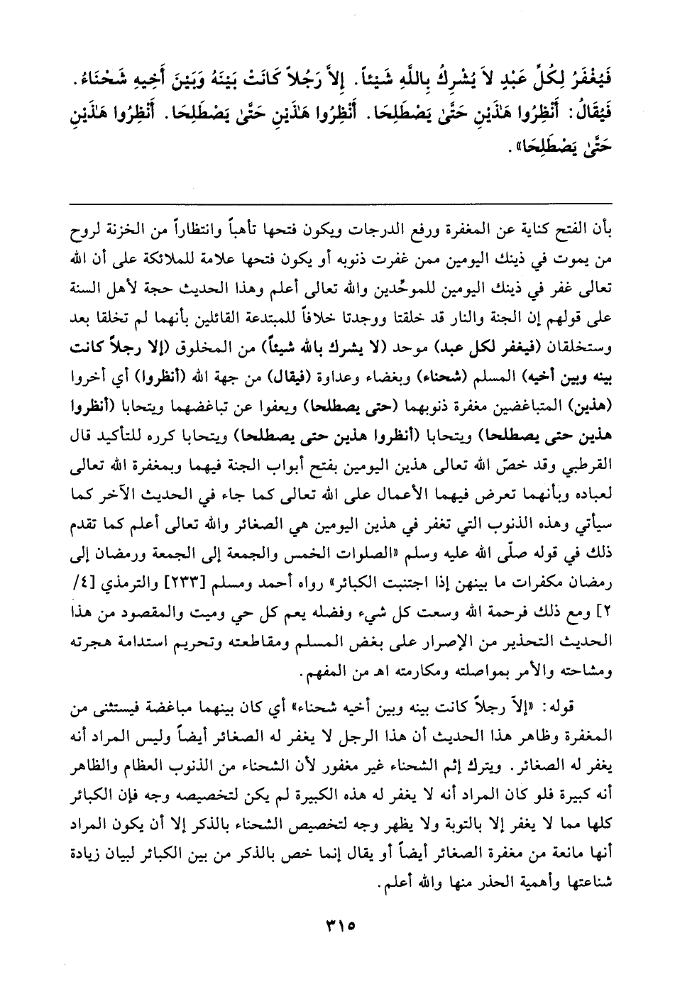 قوله: "إلَّا رجلًا كانت بينه وبين أخيه شحناء" أي كان بينهما مباغضة فيستثنى من المغفرة وظاهر هذا الحديث أن هذا الرجل لا يغفر له الصغائر أيضًا وليس المراد أنه يغفر له الصغائر. ويترك إثم الشحناء غير مغفور لأن الشحناء من الذنوب العظام والظاهر أنه كبيرة فلو كان المراد أنه لا يغفر له هذه الكبيرة لم يكن لتخصيصه وجه فإن الكبائر كلها مما لا يغفر إلا بالتوبة ولا يظهر وجه لتخصيص الشحناء بالذكر إلا أن يكون المراد أنها مانعة من مغفرة الصغائر أيضًا أو يقال إنما خص بالذكر من بين الكبائر لبيان زيادة شناعتها وأهمية الحذر منها والله أعلم.