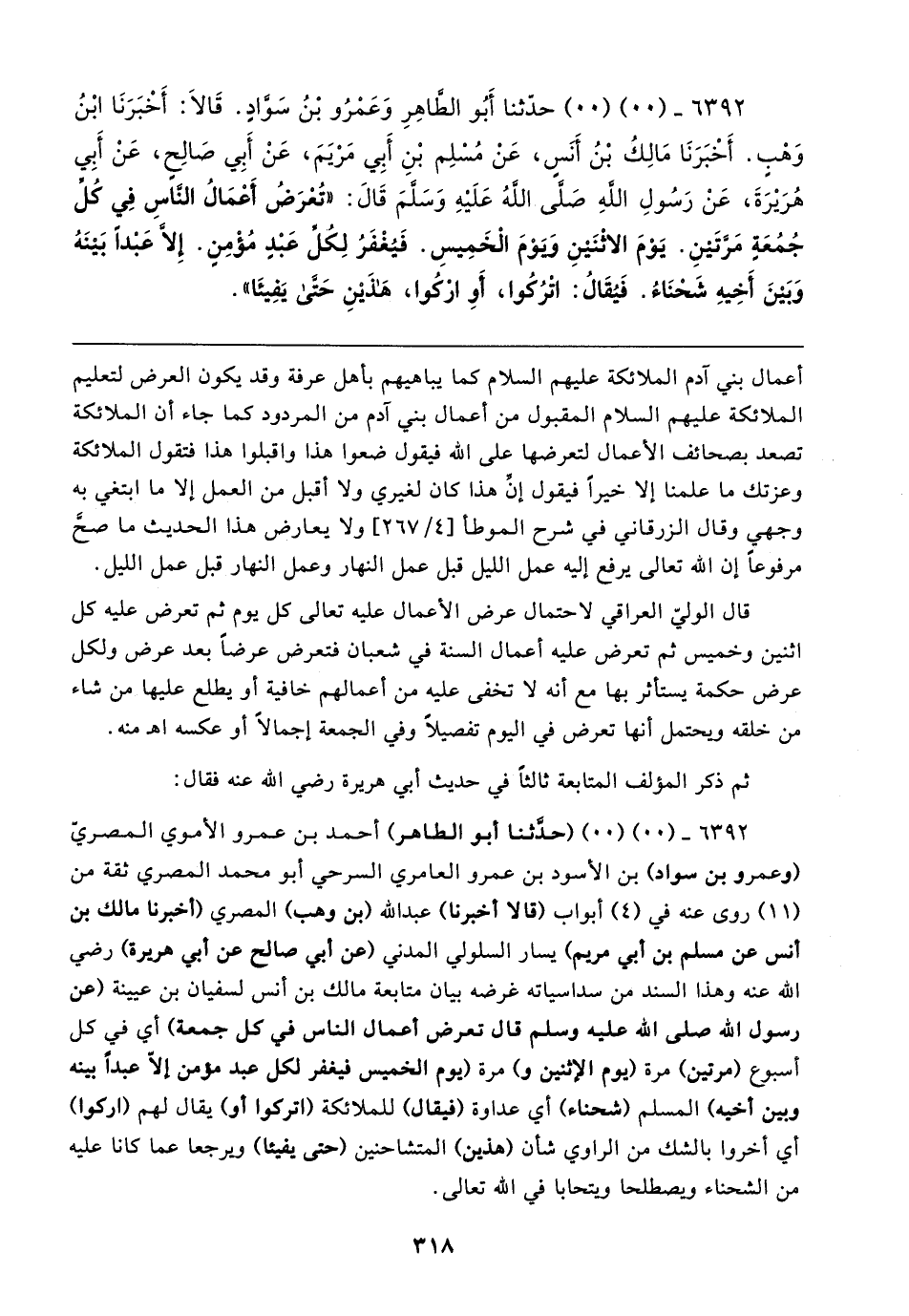 ٦٣٩٢ - (٠٠) (٠٠) حدَّثنا أَبُو الطَّاهِرِ وَعَمْرُو بْنُ سَوَّادٍ. قَالا: أَخْبَرَنَا ابْنُ وَهْبٍ. أَخْبَرَنَا مَالِكُ بْنُ أَنَسٍ، عَنْ مُسْلِم بْنِ أَبِي مَرْيَمَ، عَنْ أَبِي صَالِحٍ، عَنْ أَبِي هُرَيرَةَ، عَنْ رَسُولِ اللهِ صَلَّى اللهُ عَلَيهِ وَسَلَّمَ قَال: "تُعْرَضُ أَعْمَالُ النَّاسِ فِي كلِّ جُمُعَةٍ مَرَّتَينِ. يَوْمَ الاثْنَينِ وَيوْمَ الْخَمِيسِ. فَيُغْفَرُ لِكُلِّ عَبْدٍ مُؤْمِنٍ. إلا عَبْدًا بَينَهُ وَبَينَ أَخِيهِ شَحْنَاءُ. فَيُقَالُ: اتْرُكُوا، أَو ارْكُوا، هَذَينِ حَتَّى يَفِيئَا"