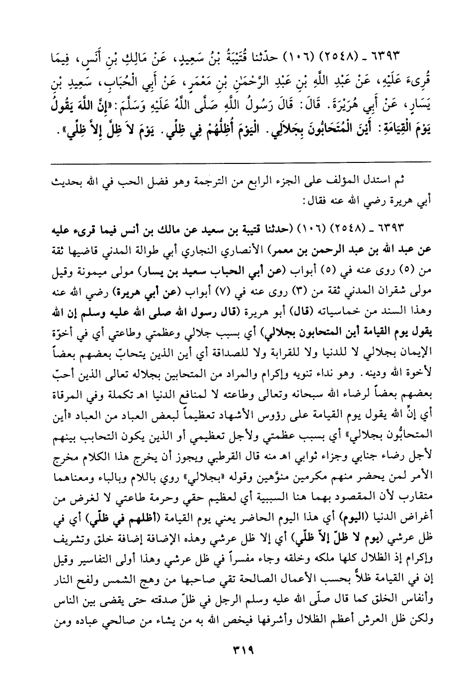 ٦٣٩٣ - (٢٥٤٨) (١٠٦) حدَّثنا قُتَيبَةُ بْنُ سَعِيدٍ، عَنْ مَالِكِ بْنِ أَنسٍ، فِيمَا قُرِئَ عَلَيهِ، عَنْ عَبْدِ اللهِ بْنِ عَبْدِ الرَّحْمَنِ بْنِ مَعْمَرٍ، عَنْ أَبِي الْحُبَابِ، سَعِيدِ بْنِ يَسَارٍ، عَنْ أَبِي هُرَيرَةَ. قَال: قَال رَسُولُ اللهِ صَلَّى اللهُ عَلَيهِ وَسَلَّمَ: "إِنَّ اللهَ يَقُولُ يَوْمَ الْقِيَامَةِ: أَينَ الْمُتَحَابُونَ بِجَلالِي. الْيَوْمَ أُظِلُّهُمْ فِي ظِلِّي. يَوْمَ لَا ظِلَّ إلا ظِلِّي"