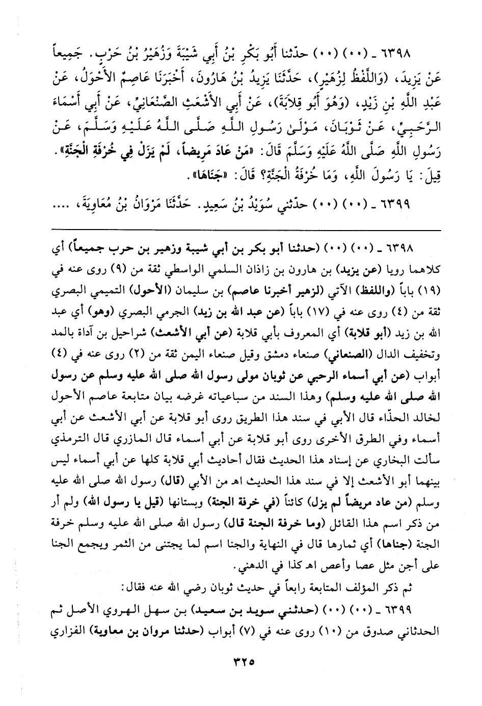 ٦٣٩٨ - (٠٠) (٠٠) حدَّثنا أَبُو بَكْرِ بْنُ أَبِي شَيبَةَ وَزُهَيرُ بْنُ حَرْبٍ. جَمِيعًا عَنْ يَزِيدَ، (وَاللَّفْظُ لِزُهَيرٍ)، حَدَّثَنَا يَزِيدُ بْنُ هَارُونَ، أَخْبَرَنَا عَاصِمٌ الأَحْوَلُ، عَنْ عَبْدِ اللهِ بْنِ زيدٍ، (وَهُوَ أَبُو قِلابَةَ)، عَنْ أَبِي الأشعَثِ الصَّنْعَانِيِّ، عَنْ أَبِي أَسْمَاءَ الرَّحَبِيِّ، عَنْ ثَوْبَانَ، مَوْلَى رَسُولِ اللهِ صَلَّى اللهُ عَلَيهِ وَسَلَّمَ، عَنْ رَسُولِ اللهِ صَلَّى اللهُ عَلَيهِ وَسَلَّمَ قَال: "مَنْ عَادَ مَرِيضًا، لَمْ يَزَلْ فِي خُرْفَةِ الْجَنَّةِ". قِيلَ: يَا رَسُولَ اللهِ، وَمَا خُرْفَةُ الْجَنَّةِ؟ قَال: "جَنَاهَا".