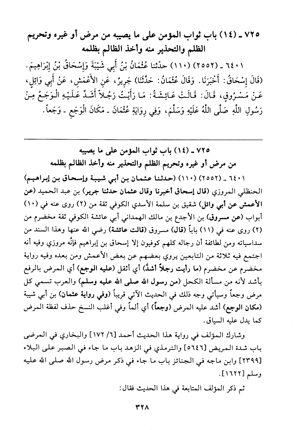 ٧٢٥ - (١٤) باب ثواب المؤمن على ما يصيبه من مرض أو غيره وتحريم الظلم والتحذير منه وأخذ الظالم بظلمه