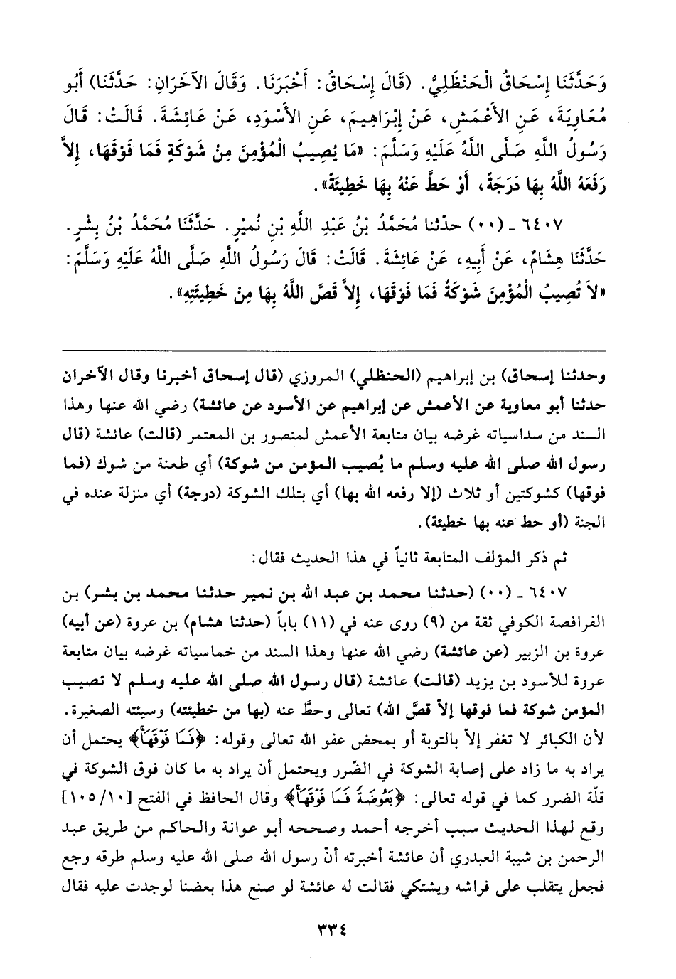وَحَدَّثَنَا إِسْحَاقُ الْحَنْظَلِيُّ. (قَال إِسْحَاقُ: أَخْبَرَنَا. وَقَال الآخَرَانِ: حَدَّثَنَا) أَبُو مُعَاويةَ، عَنِ الأَعْمَشِ، عَنْ إِبْرَاهِيمَ، عَنِ الأَسْوَدِ، عَنْ عَائِشَةَ. قَالتْ: قَال رَسُولُ اللهِ صَلَّى اللهُ عَلَيهِ وَسَلَّمَ: "مَا يُصِيبُ الْمُؤْمِنَ مِنْ شَوْكَةٍ فَمَا فَوْقَهَا، إلا رَفَعَهُ اللهُ بِهَا دَرَجَةً، أَوْ حَطَّ عَنْهُ بِهَا خَطِيئَةً".